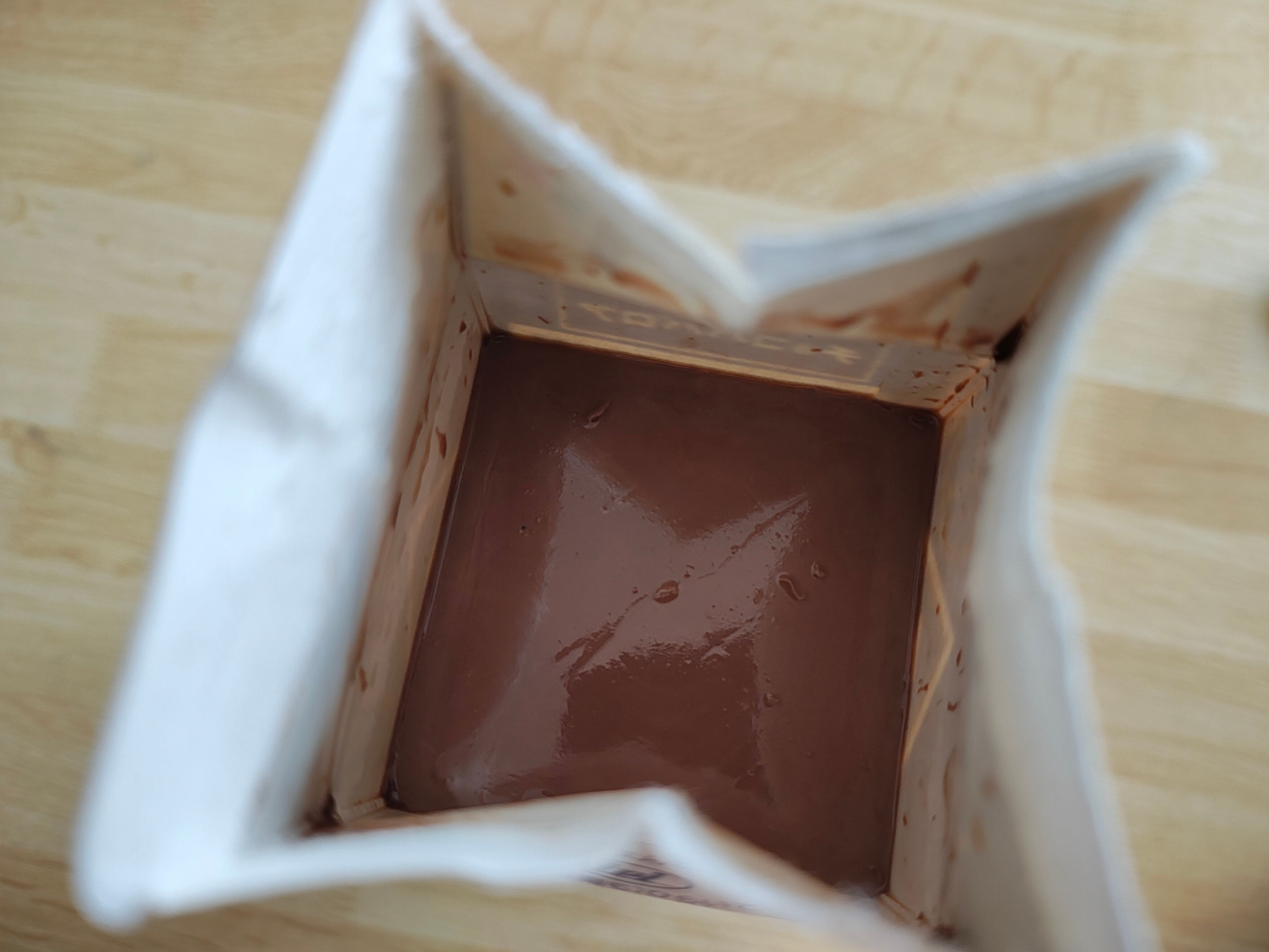 パックを開けてみると、プルプルのチョコババロアが見えました。食べてみると、少しもっちり。ほろ苦いチョコの濃厚な風味をしっかり感じます。甘いものが好きなかたは、生クリームをトッピングするのがおすすめです。