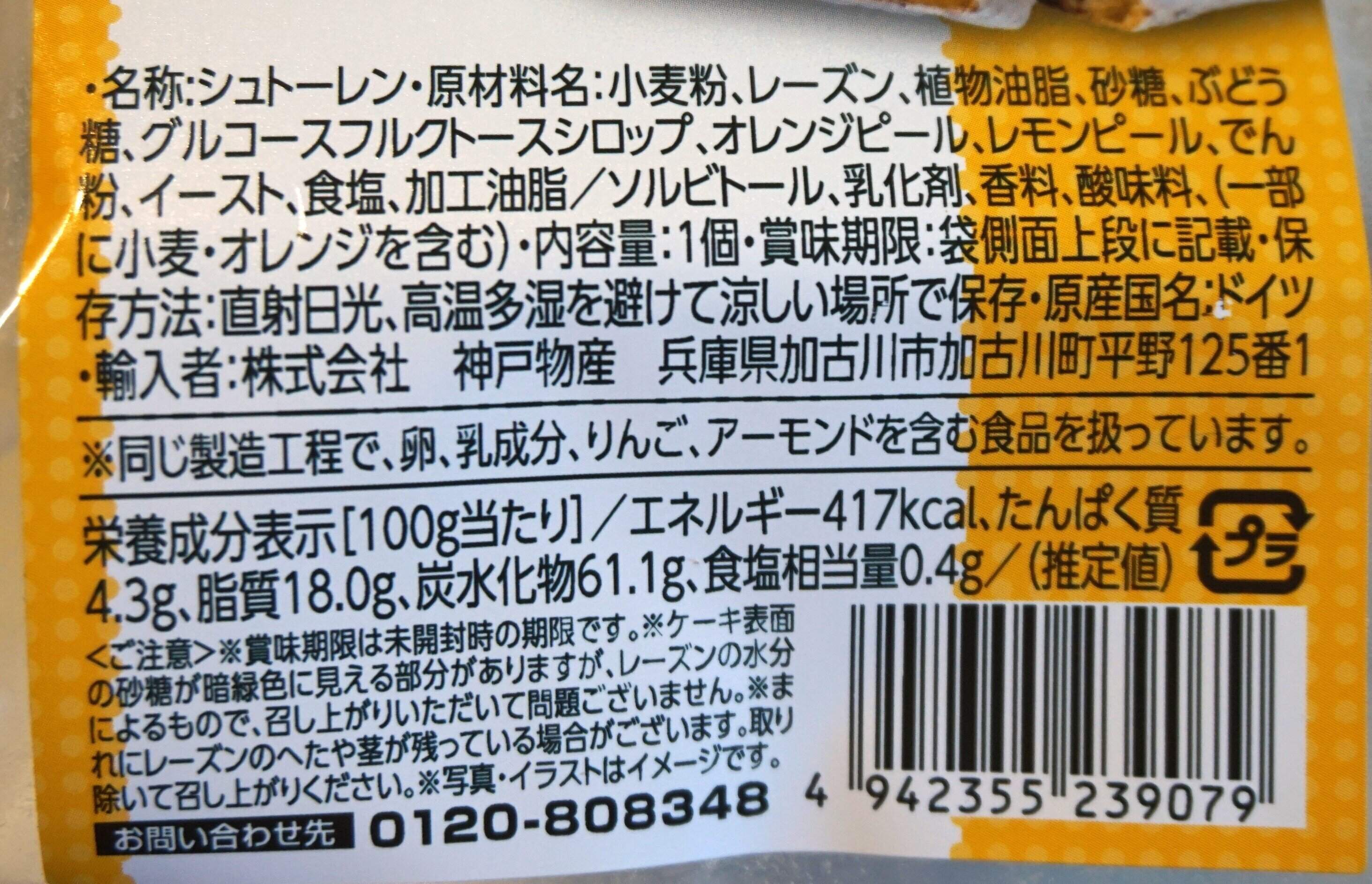 生地にはレーズン、オレンジピールやレモンピールなどがたっぷり練り込まれています。生地よりもドライフルーツが主役といった印象です。