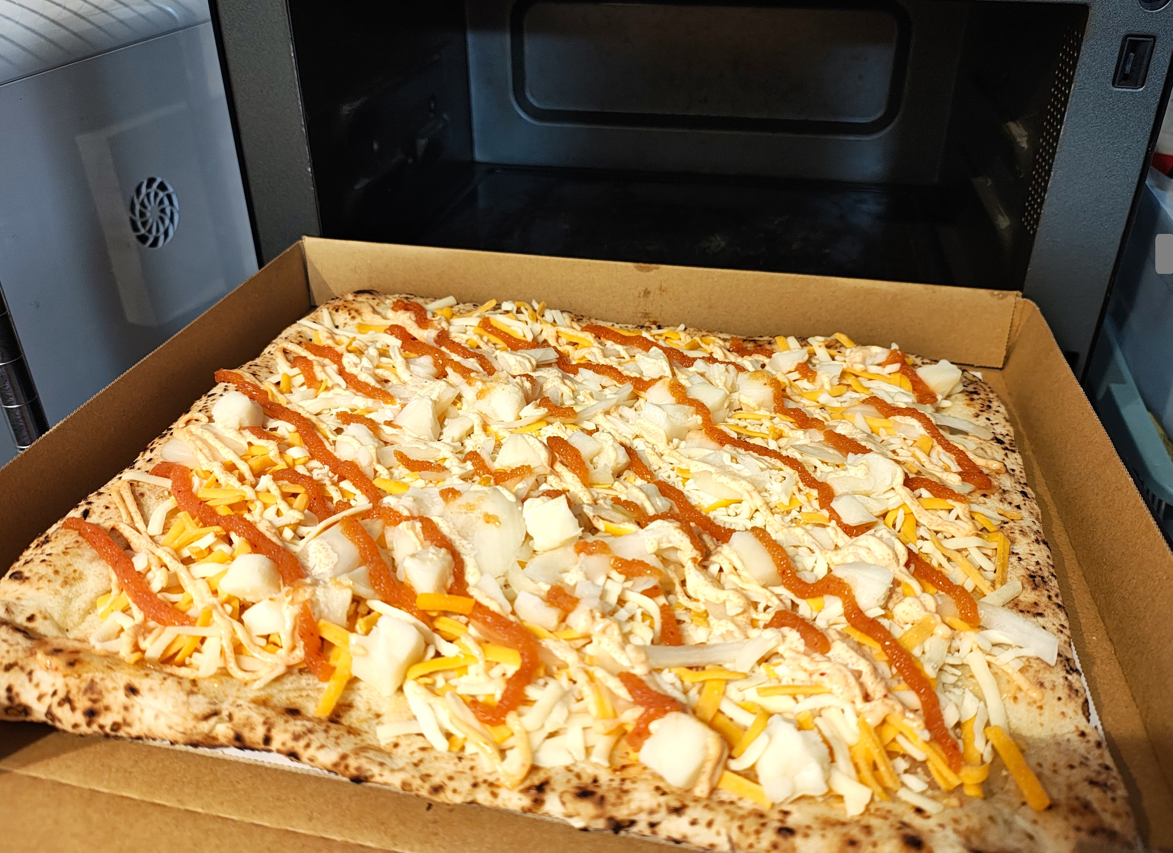 ピザの大きさはだいたい30cm×35cm。「もしかして丸ごと1枚オーブンに入るかな?」と思いましたが、我が家のオーブンよりピザのほうが少し大きめでした。