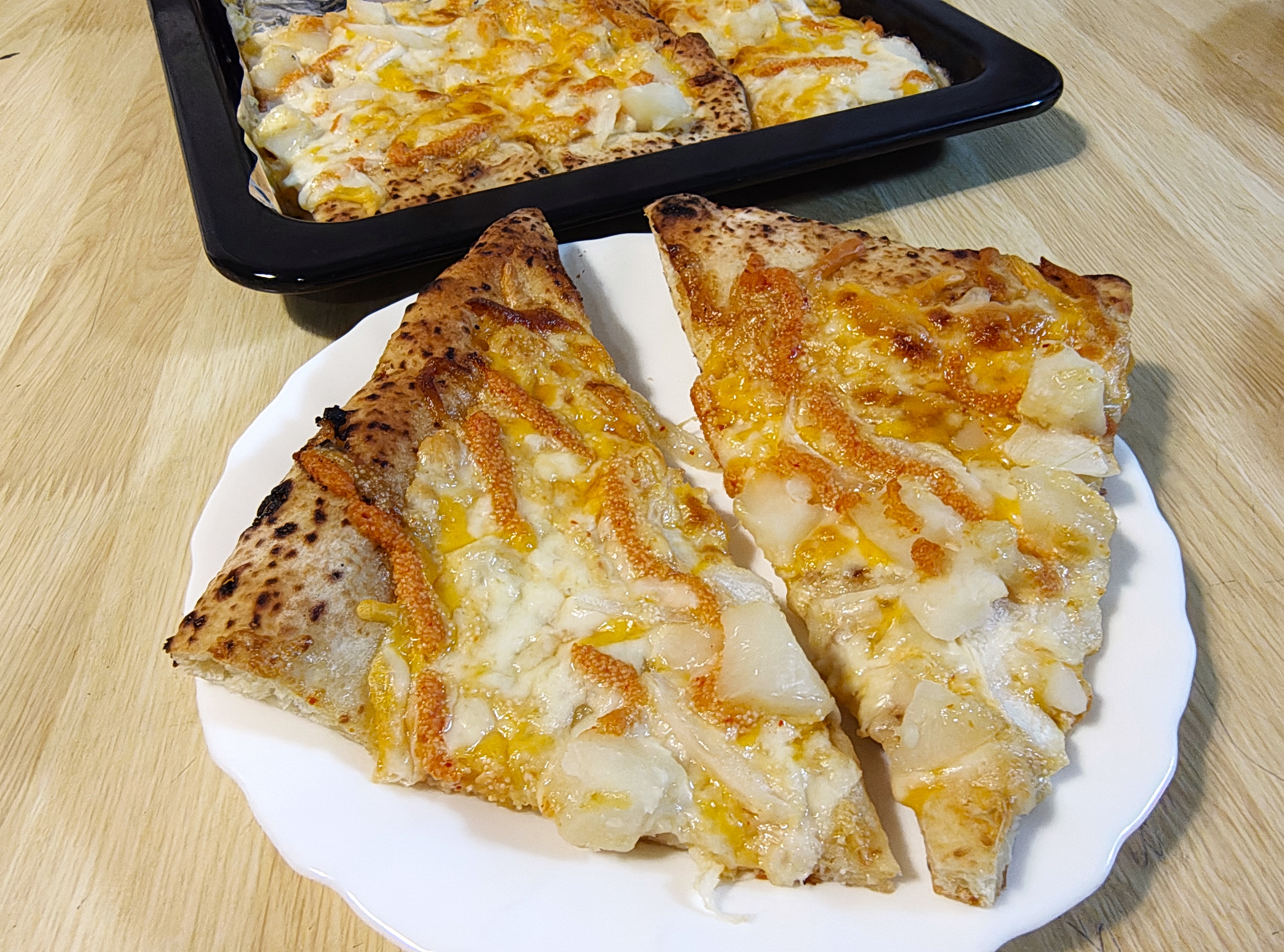 明太子のソースが2種類かかっているこだわり和風ピザです。ソースのほかにはチーズ、じゃがいも、玉ねぎがトッピングされています。チーズも2色が乗っています。