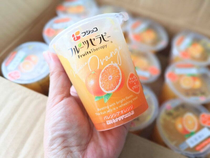 ふるふるっと柔らかめのゼリーに、オレンジの果肉とナタデココがゴロゴロっと詰まった商品。