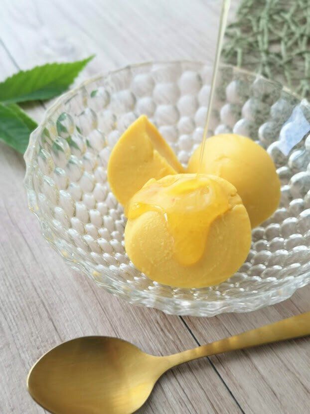牧家の丸い風船プリン、限定フレーバーの「マンゴープリン」です。