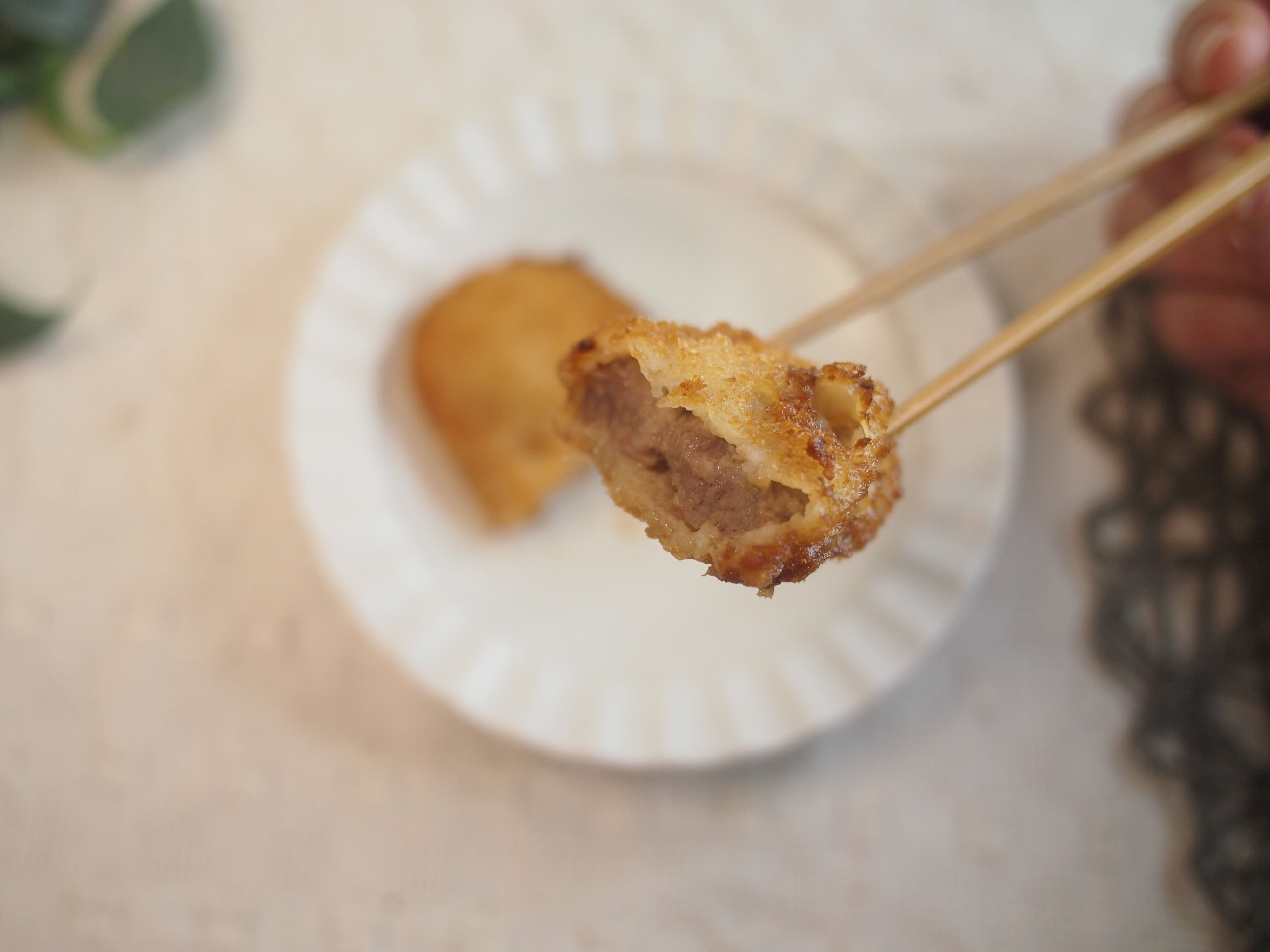 揚げたて熱々を割ってみると、サクッと音がでるほどサクサクの衣に肉汁が広がる豚肉が顔を出します。見た目から唾をゴクリと飲んでしまうほどの姿。