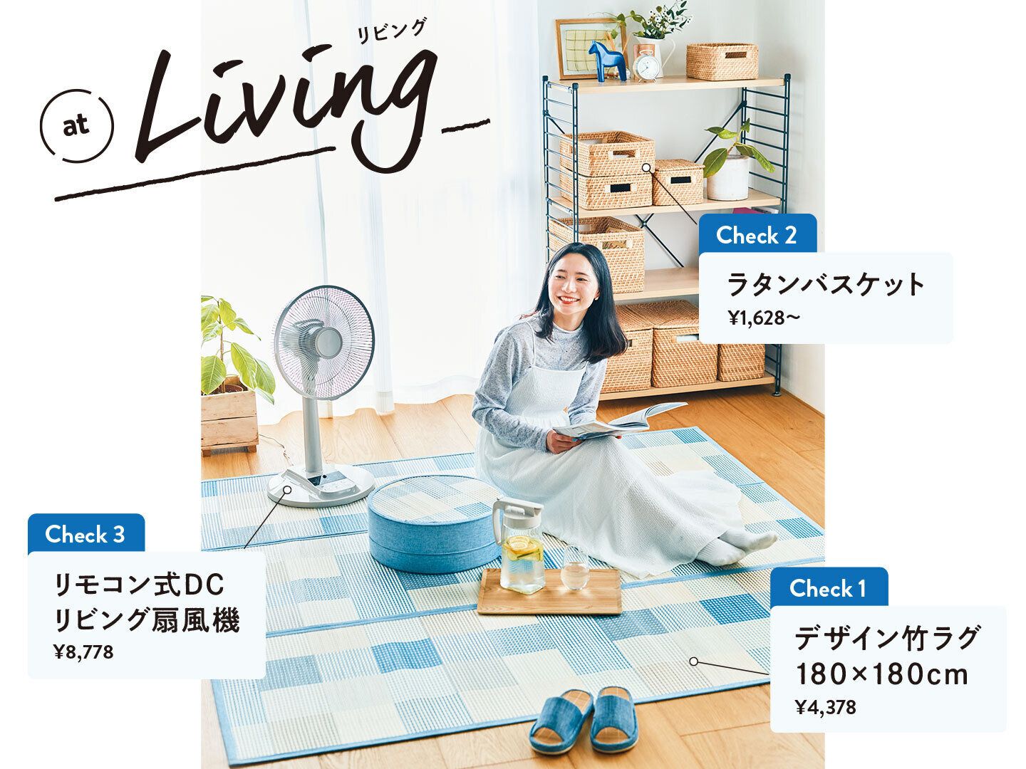 (上の写真)すべてトップバリュ ホームコーディの商品。「デザイン竹ラグ180×180cm」¥4,378、「竹スツールクッション」¥3,278、窓からの熱を防ぐ「花粉キャッチ・遮熱レースカーテン」(100×176cm・2枚組)¥2,728、「リモコン式DCリビング扇風機」¥8,778、「サラッと竹コンフォートスリッパ」¥877、「パッキン一体型ワンプッシュピッチャー 1.6L」¥987、「ティアドロップグラス」¥327、「マルチ収納ラック4段」¥19,580、「ラタンバスケット」各¥3,278 、「ラタンバスケット ハーフ」各¥2,178、「ラタンバスケット 縦ハーフ」¥2,178、「ラタンバスケット クォーター」各¥1,628、「ラタンふた」各¥1,078、「ラタンふた ハーフ」各¥657 ※クレジットのない物はスタイリスト私物。