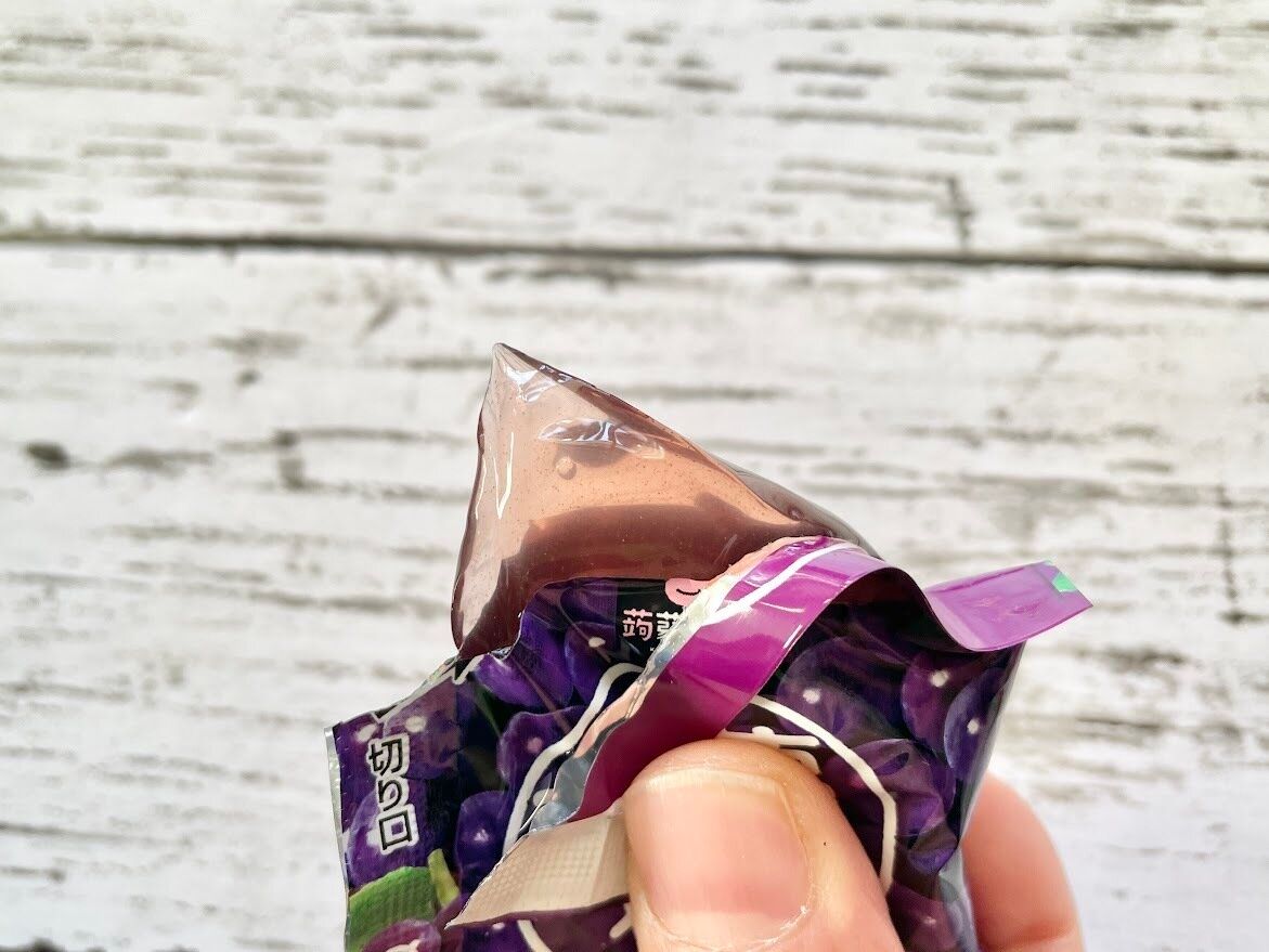 カップに入ったゼリーではなく、ひとくちサイズの袋入りタイプ。端を切って、押し上げながら食べる蒟蒻ゼリーです。