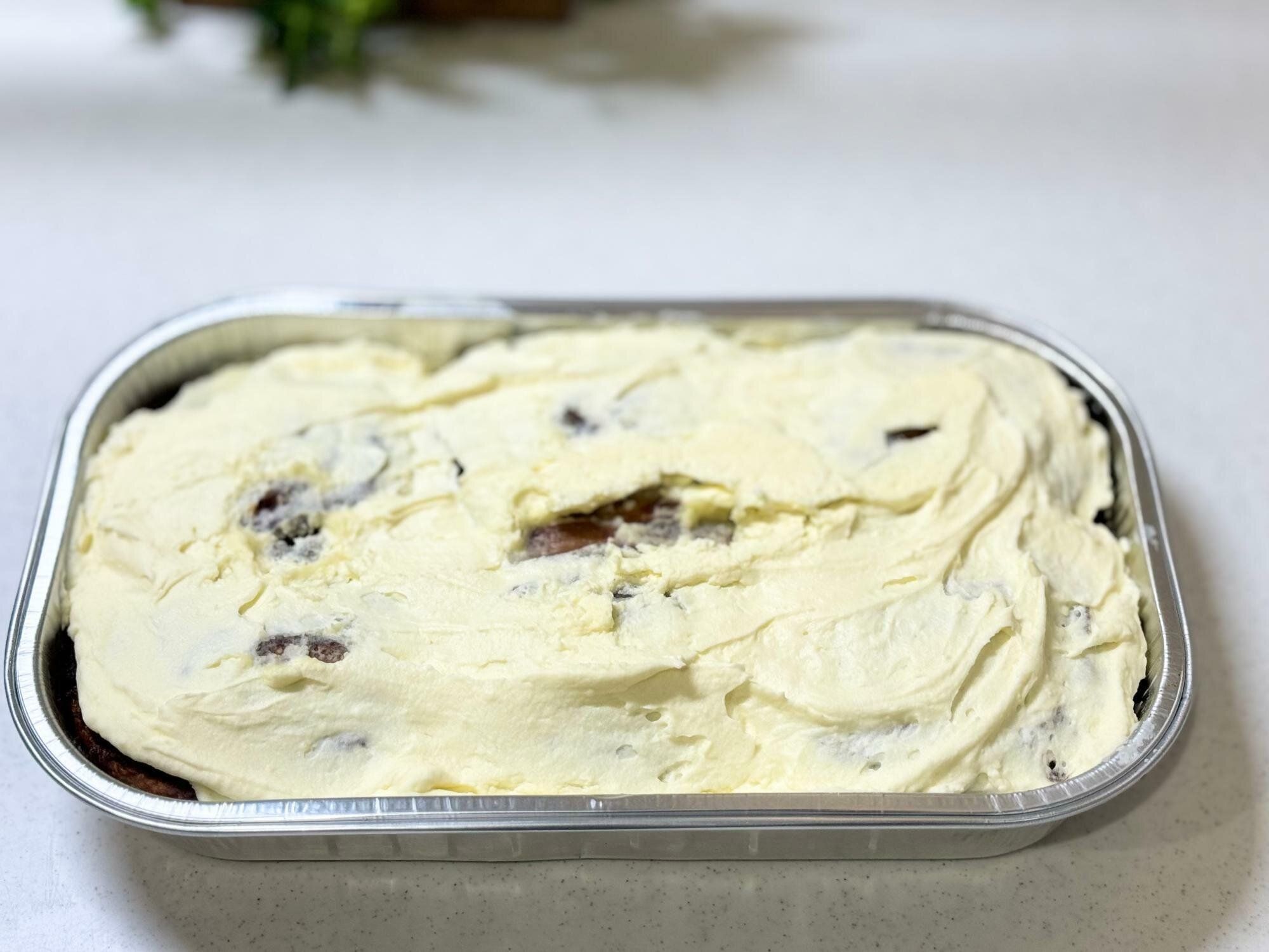 見た目からじゃ何の商品かわからないのですが、表面にたっぷりとおおわれているのはチーズアイシングクリーム。その下にシナモンロールが6個はいっています。