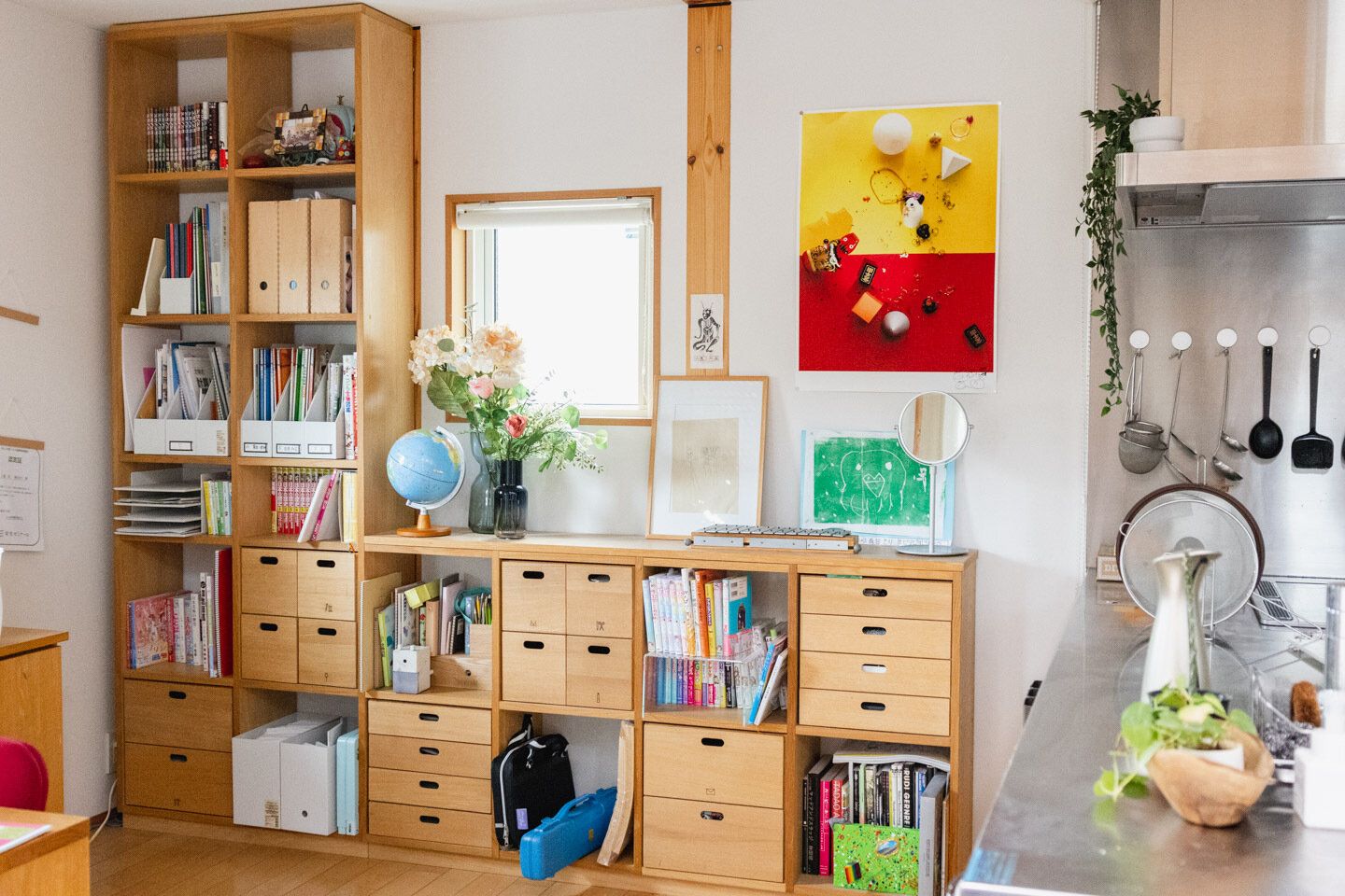 見せていいものはオープンに。隠したいものは引き出しやラックと組み合わせて。縦にも横にも置けて、組み合わせ自在!これがあるおかげで本やこまごましたものまですっきり収納できるし、「あれどこいったっけ?」なんてこともありません。