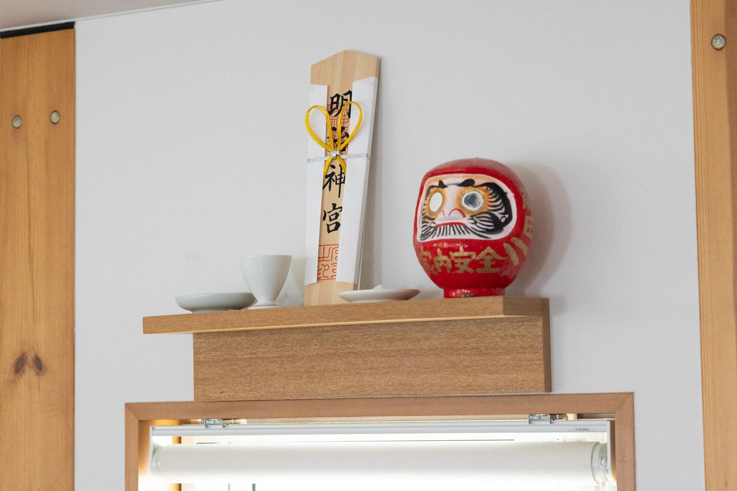 ベッドコーナーの壁では神棚として使っています。簡易的なものですが、お札やダルマを飾って置くのにぴったり。