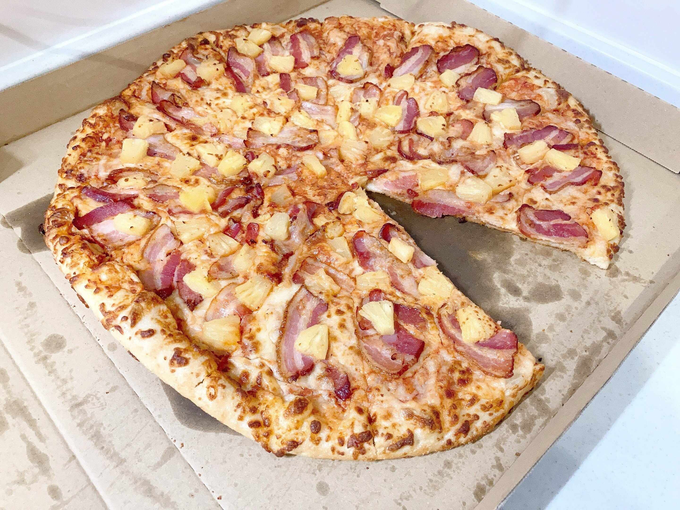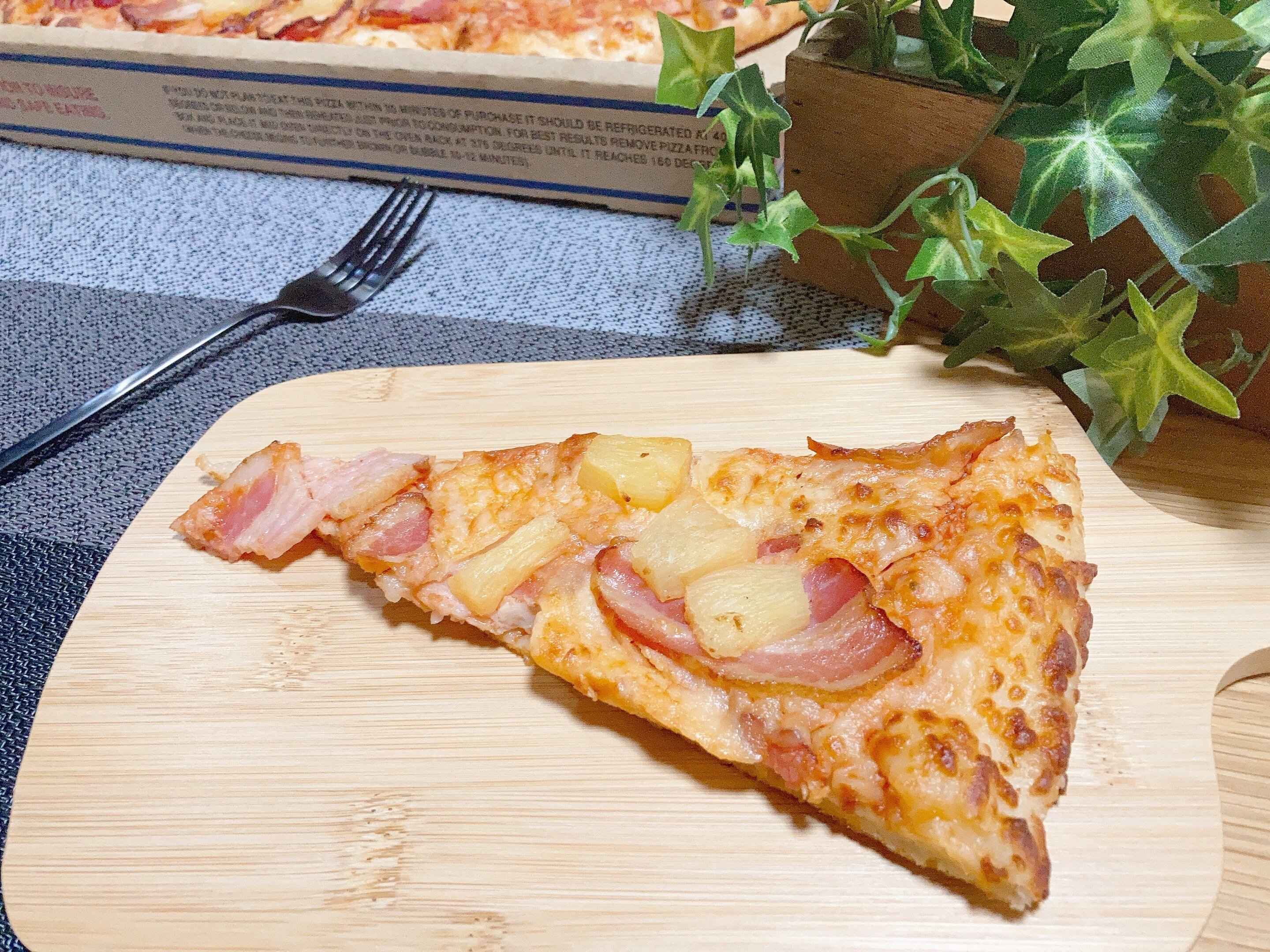 日本人には馴染みのない味かもしれませんが、トマトソースベースの生地にベーコン、パイナップルがトッピングされて焼かれている商品。