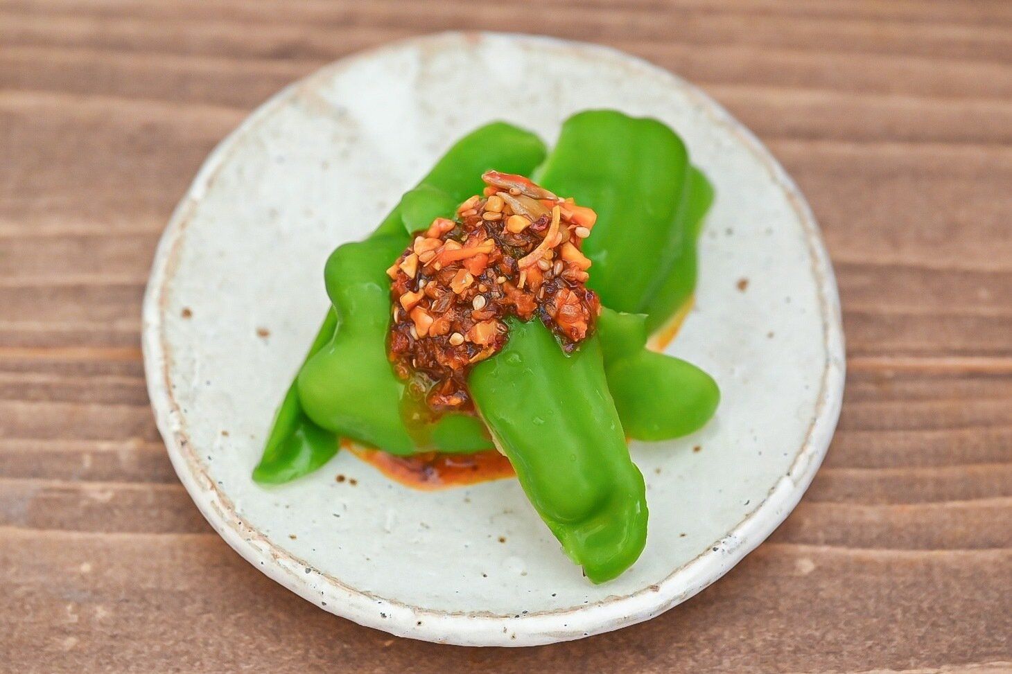 氷水で冷やしたシャキシャキ食感のピーマンとザクザク食感の食べるナッツソースは相性バッチリですよ。