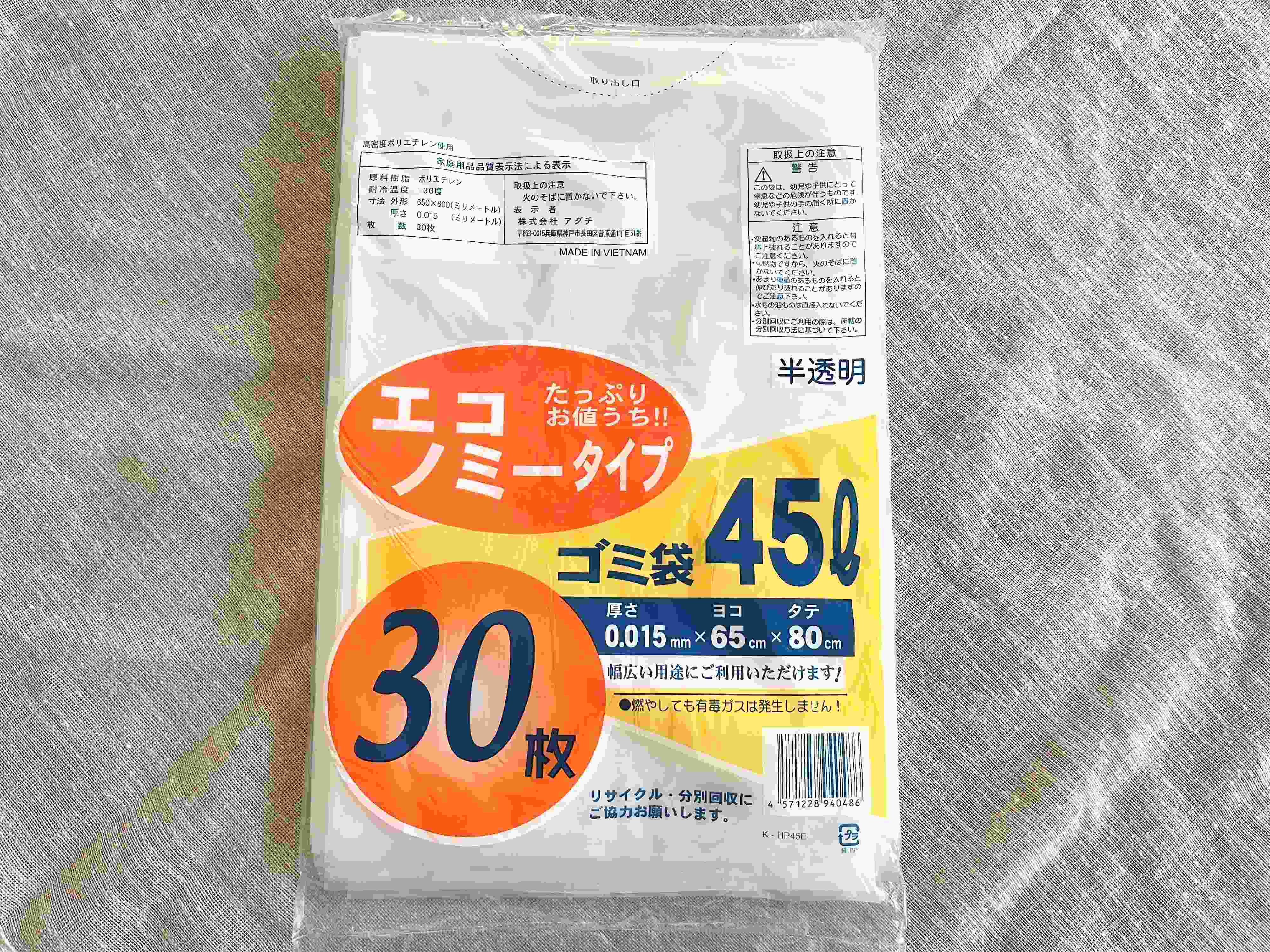 はじめにご紹介するのが取っ手のないゴミ袋。45Lサイズで、半透明タイプとなっています。容量はたっぷり30枚入り!