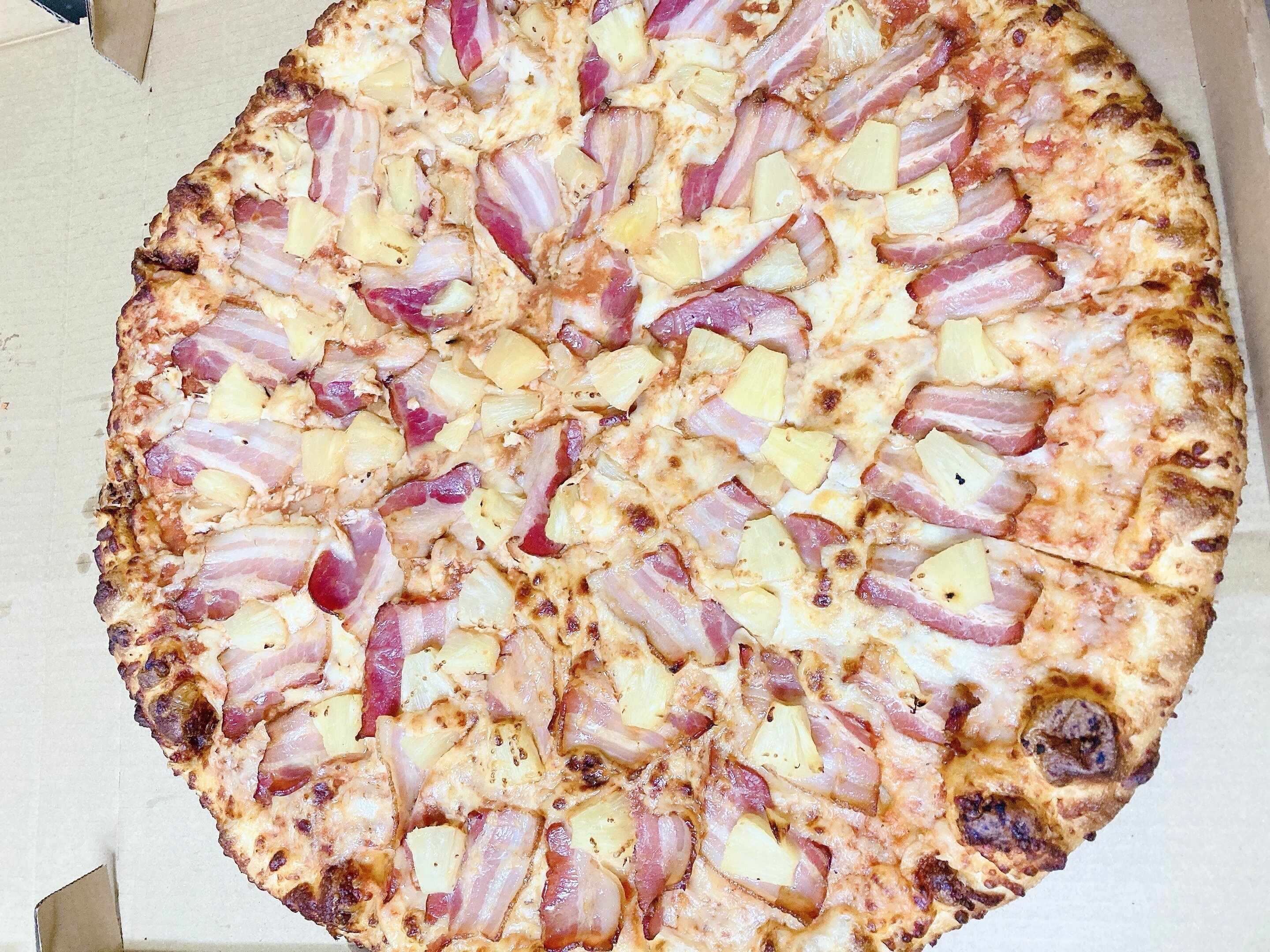 トマトソースベースのピザにトッピングは、ベーコン、チーズ、パイナップル!