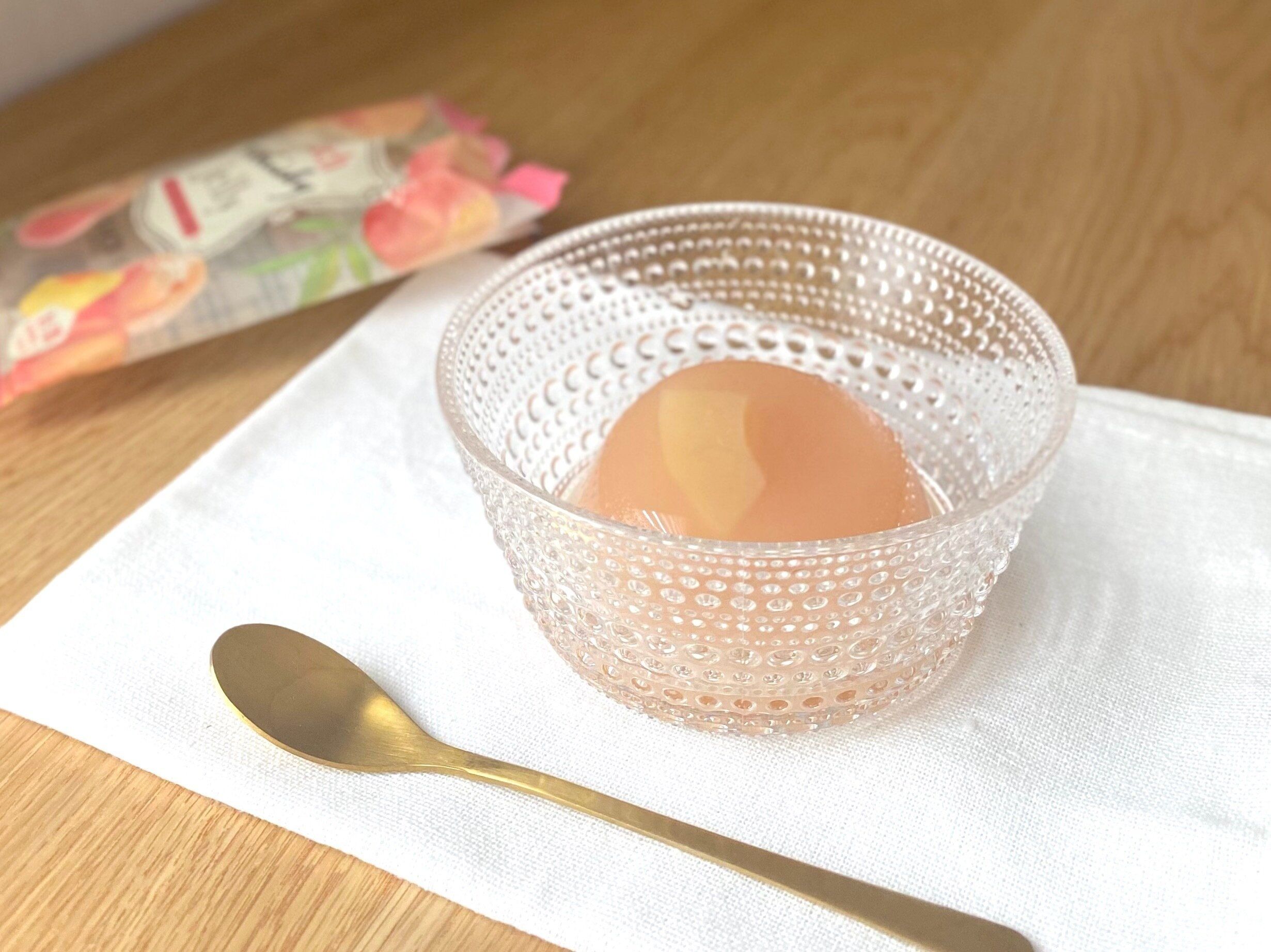 さわやかなピーチゼリーにウイスキーが入った大人のスイーツ。製菓衛生士の資格を持つスイーツ&カルディマニアのなかべぇさんに教えてもらいました。