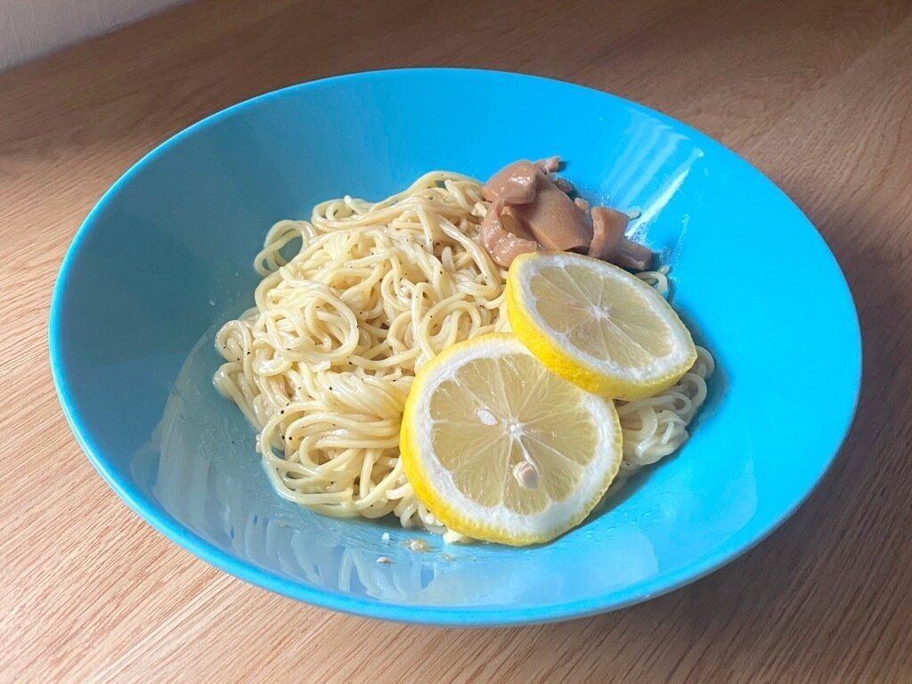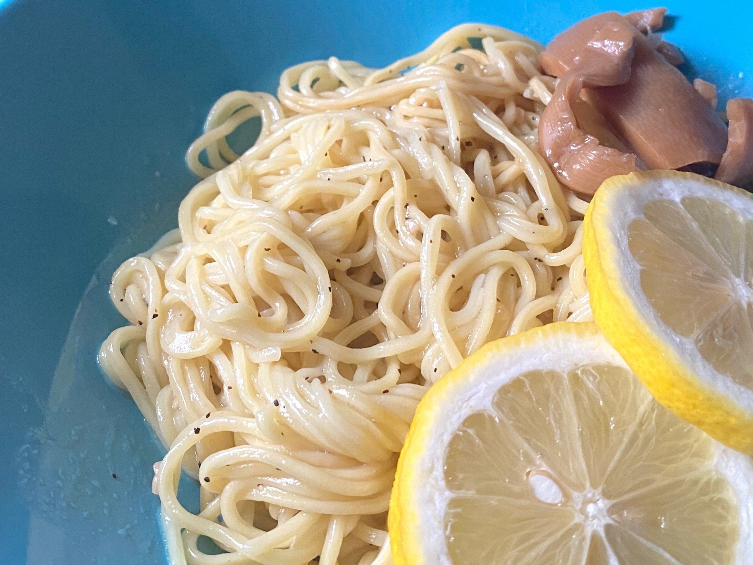 口に入った瞬間はレモンの香りと酸味を強く感じますが、チキンの旨みとにんにくの香りがきいているので後味はまやかな酸味に。胡椒のピリ辛さがほどよくアクセントになっていて、全体的にさっぱりと食べやすい味わいです。麺はコシがありながらも歯切れのよいタイプで食べ応えも抜群。