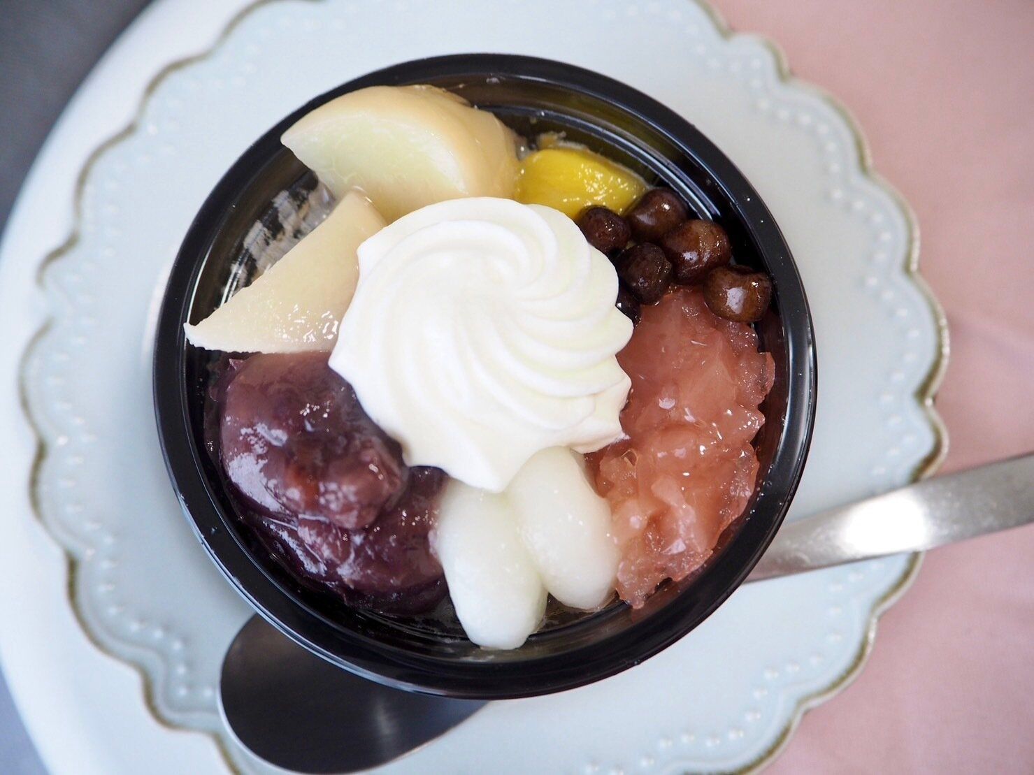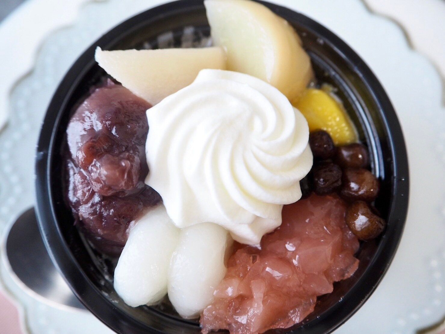 白玉風団子のもちもち具合、白桃ゼリーのつるっとしたのどごし、あんみつのこりこり食感、甘すぎないホイップのふわっと感、歯ごたえのある塩豆の存在感…1つ1つのレベルが高く、食材や製法へのこだわりを感じます。