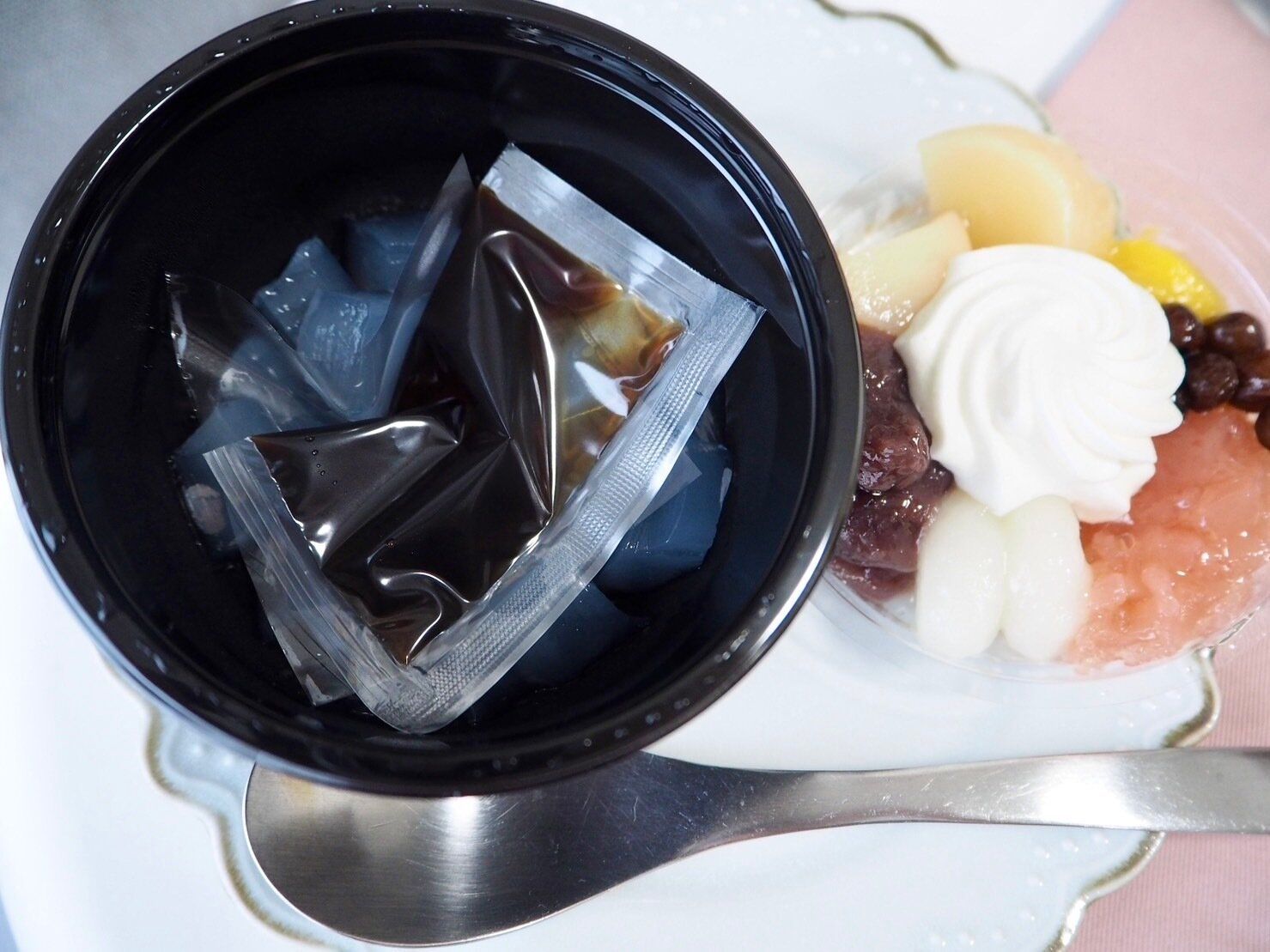 そのまま食べられそうな見た目ですがカップは二段式になっており、上段にトッピング、下段にたっぷりのあんみつと付属の黒蜜がはいっています。