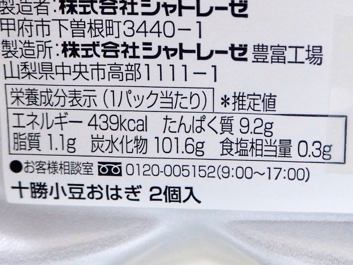 大きなおはぎ、気になるカロリーは1パックあたり439kcalです。