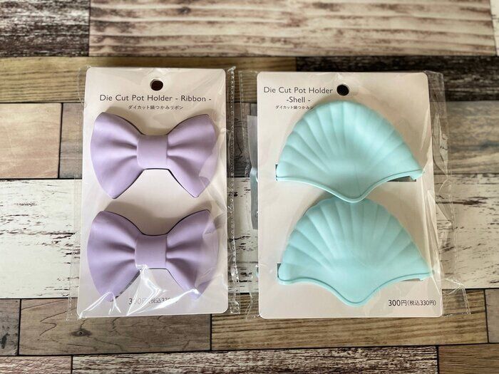 ご紹介するのは「ダイカット鍋つかみ」です。シリコン製の鍋つかみでリボン型とシェル型があり、それぞれ価格は330円。