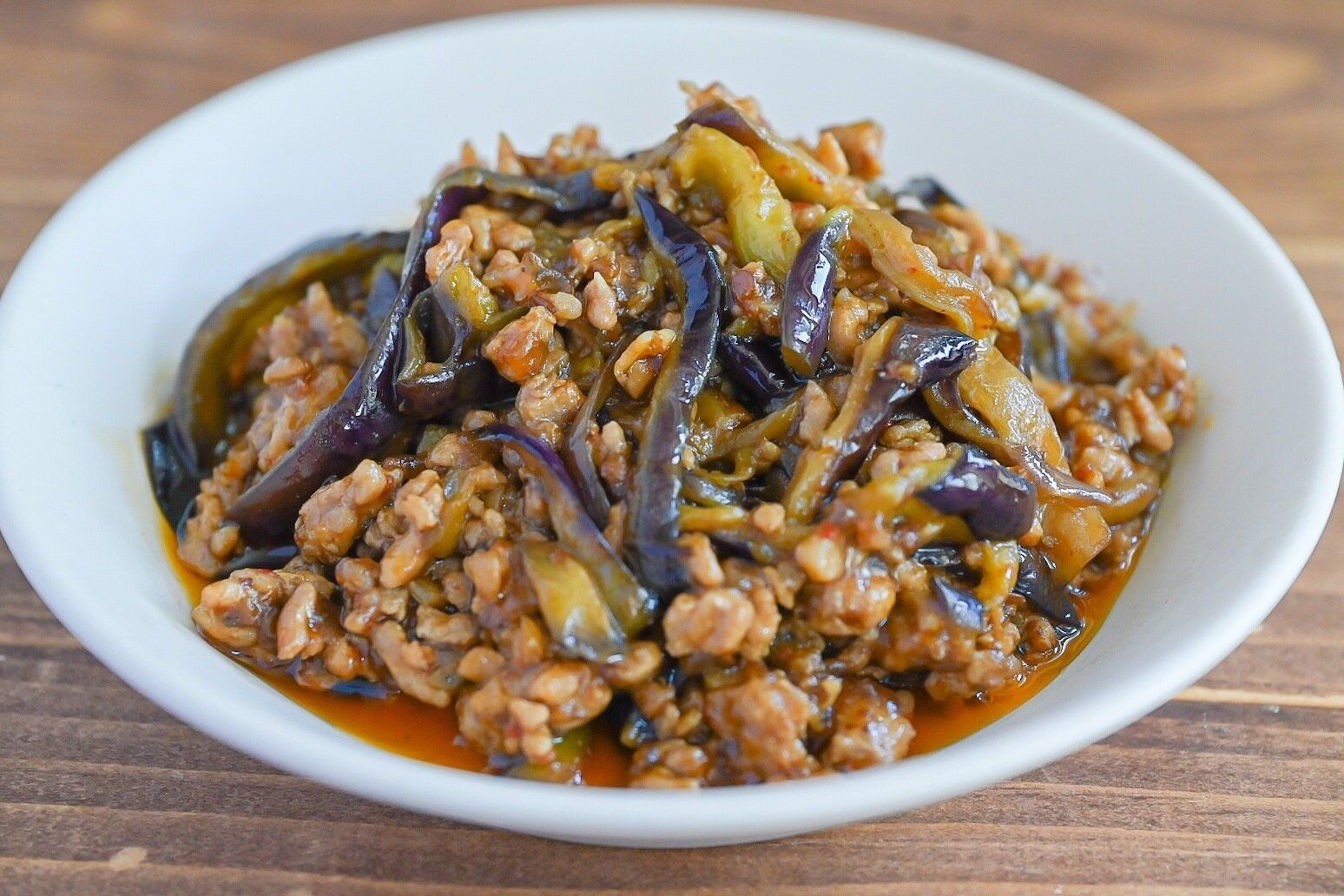 (4)「食べるガラムマサラ」、酒、しょうゆを加えて1分加熱し、なすを戻し入れて全体を炒め合わせる。