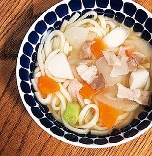 大根、にんじん、里いも、ごぼう、ねぎに加え、豚肉入り。「短時間調理で、汁ものや麺類など、野菜不足のときにも便利です」(西)