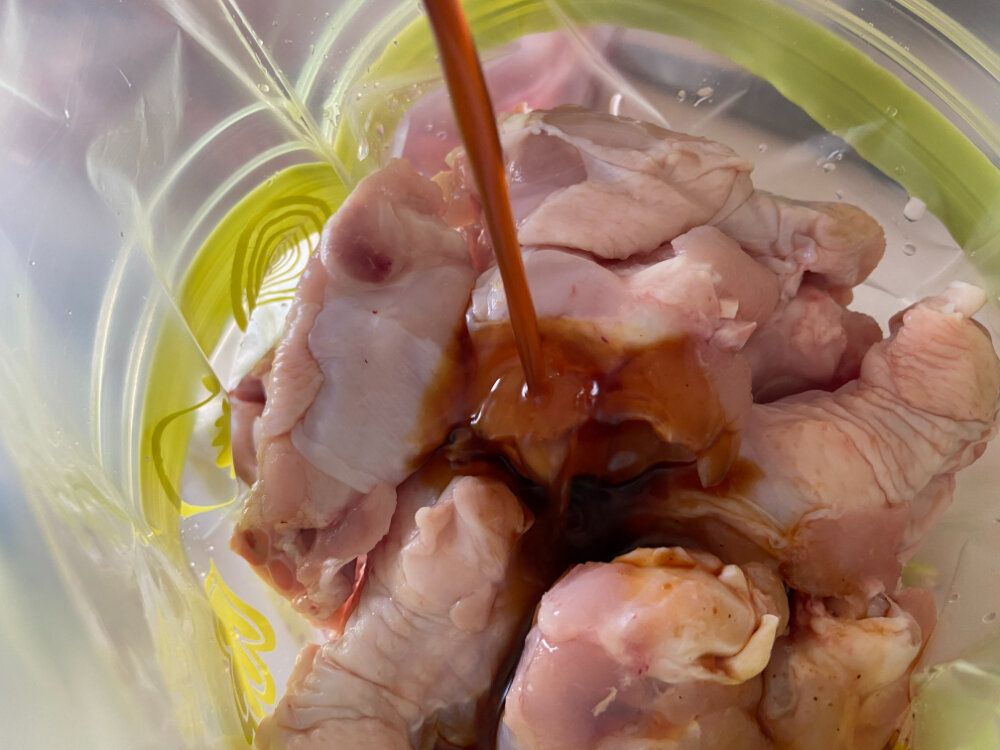 まずチャック付きの保存袋に手羽もとを入れて、酒と焼肉のたれを注ぎ入れます。