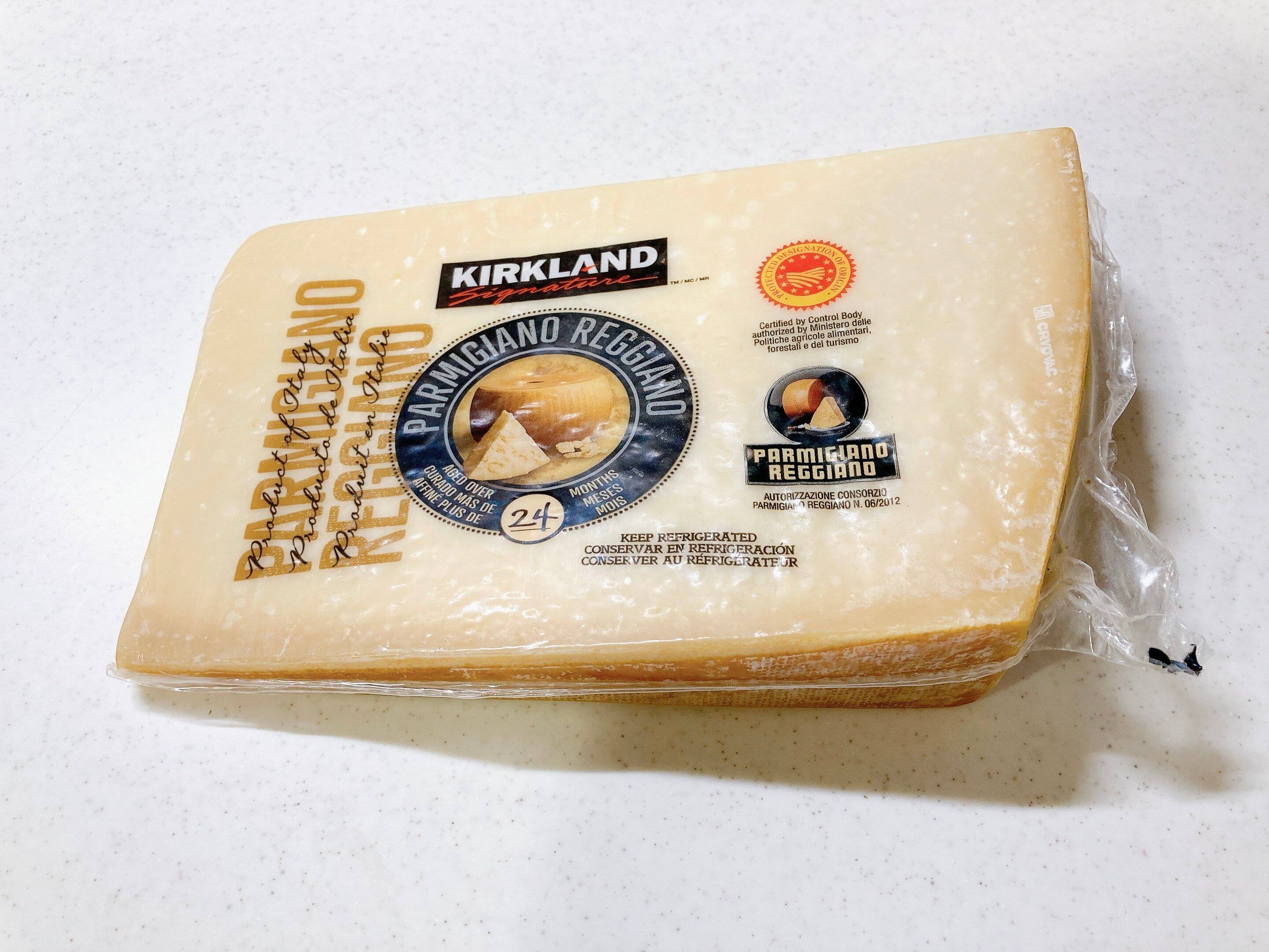 ドーンと大きなこちらのチーズは「パルミジャーノ・レッジャーノ24ヶ月」。24ヶ月はこの期間熟成された商品ということ。また、こちらの特徴はコストコのプライベートブランド「カークランドシグネチャー」であること。