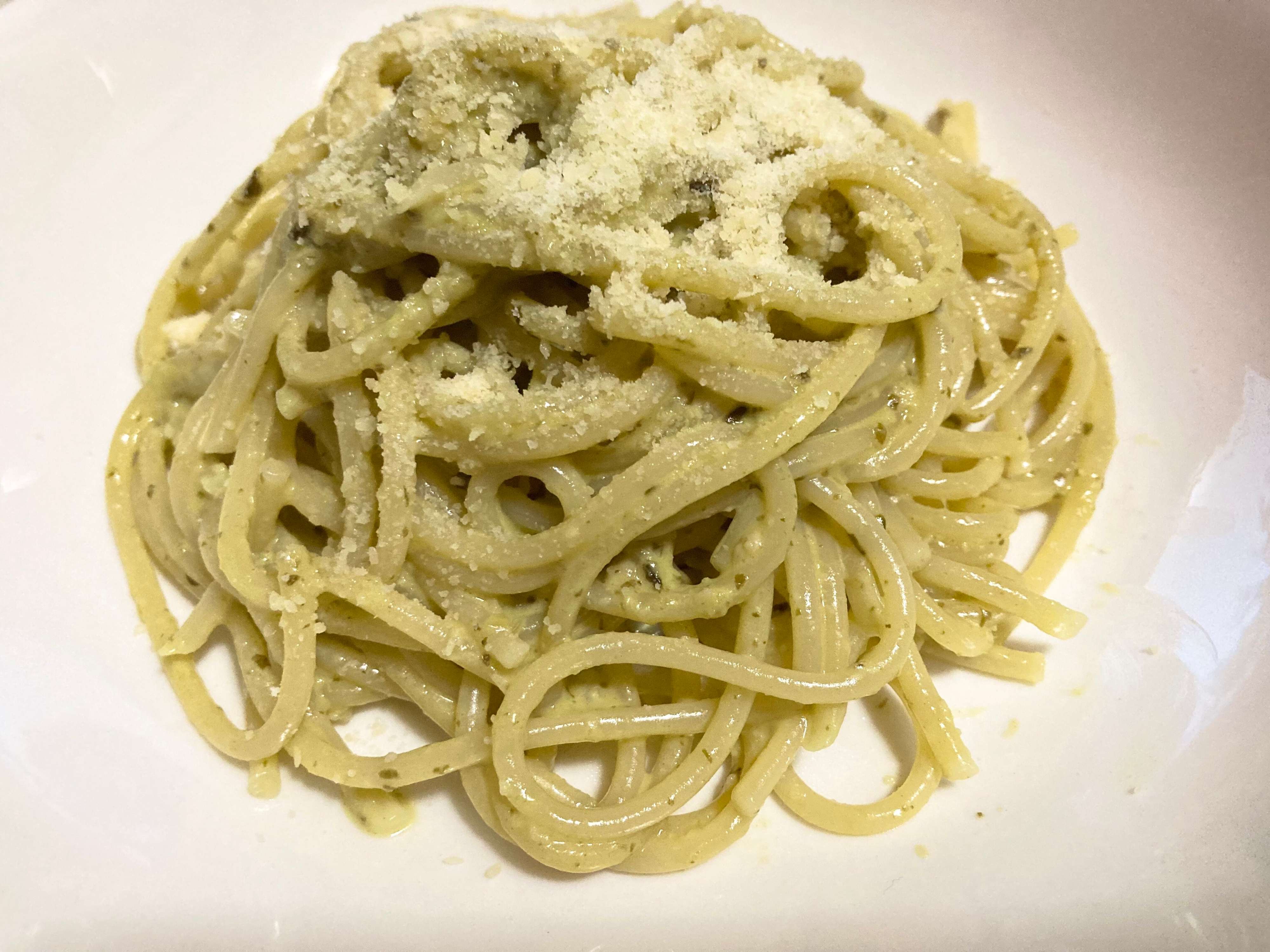 今回は、茹でたパスタにジェノベーゼソースを混ぜ、パルジャミーノ・レッジャーノを削ってトッピングをしました。濃厚なパスタにも負けない、うまみがたっぷりのパルジャミーノ・レッジャーノ。自宅で食べるパスタが、一気に本格レストランの味に早変わりしました。