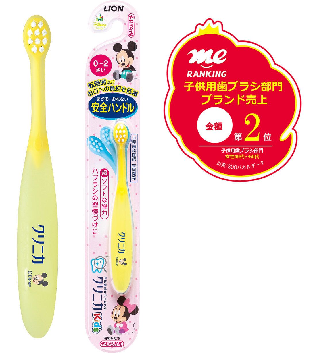 お子さまの歯みがきは「のどをつっついてしまわないかな?」、「歯ぐきを傷つけないかな?」とママやパパは心配ですよね。ライオンの「クリニカKids ハブラシ」は、曲がる・おれない安全ハンドル! 0-2才用は安心してハブラシの習慣づけができる「超ソフトな弾力」、3-5才用はきちんとみがける「ソフトな弾力」と、それぞれのハンドルの弾力を変えています。安全・安心+お子さまの適切なオーラルケアを同時に考えている素晴らしい商品です! 多くのかたに支持(金額2位)されているのも納得ですね。初めてのキッズ歯ブラシにおすすめです。