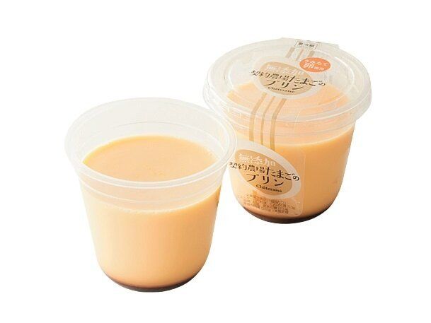 飼料にこだわり、コクとうまみを追求した専用卵を使用。材料は牛乳、卵、砂糖のみ。無添加ならではのおいしさを108円で。