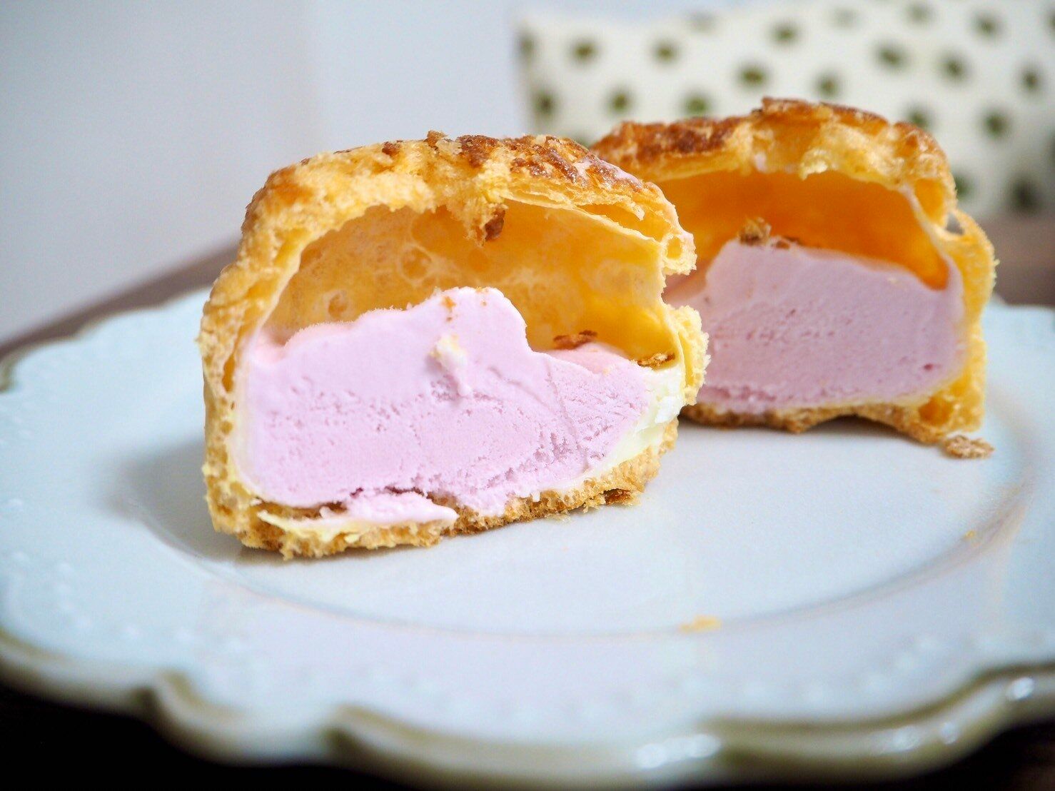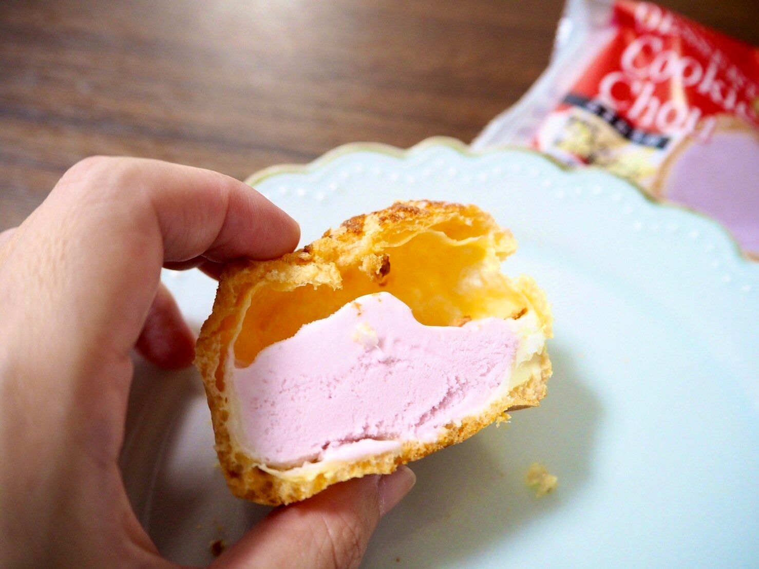シュー生地とアイスの隙間をよく見ると、白くなっている部分がありますが、こちらはホワイトチョコ。思ったよりも分厚く入っているのが確認できます。