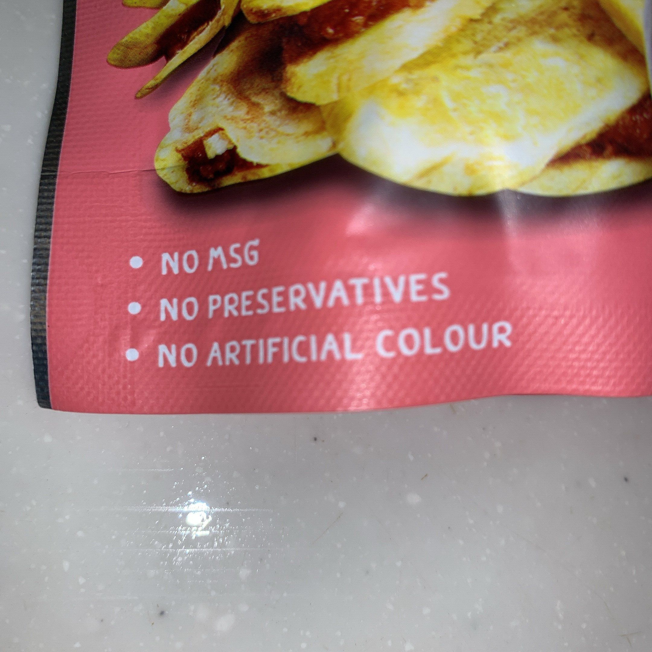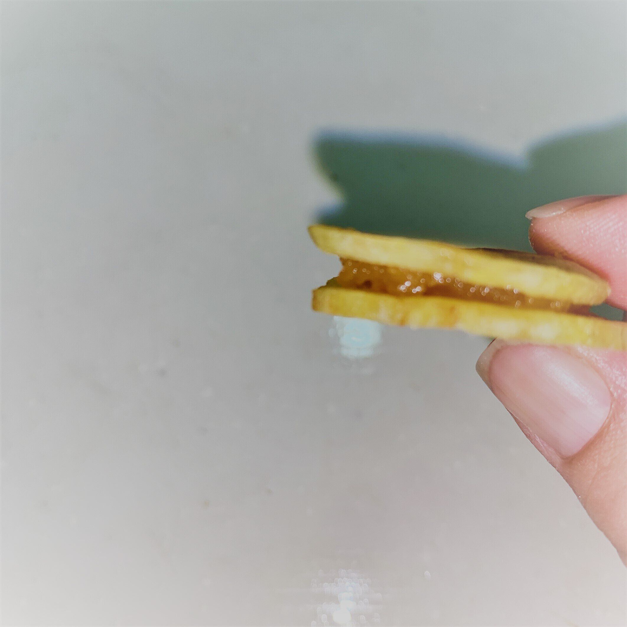 2枚のバナナチップスの間に、パッションフルーツが入ったタマリンドジャムが挟んであります。