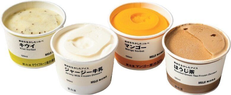 *取り扱いのない店舗もあります。右から「素材を生かしたアイス・ソルベ ほうじ茶」、「同 マンゴー」、「同 ジャージー牛乳」、「同 キウイ」