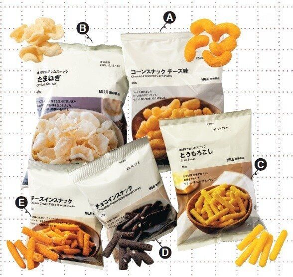 「コーンスナック チーズ味」、「素材を生かしたスナックたまねぎ」、「同 とうもろこし」、「チーズインスナック」、「チョコインスナック」