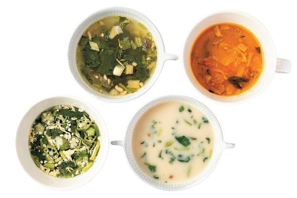 右上から「食べるスープ 4種野菜のみそトマトスープ」、「同 揚げ茄子と豚肉の生姜スープ」、「同 きのことチキンのポルチーニポタージュ」、「同 オクラ入りねばねば野菜のスープ」(各4食)各¥390