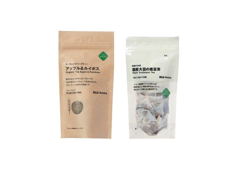 「穀物のお茶 国産大豆の黒豆茶」(1.8g×10袋)¥250、「オーガニックハーブティー アップル&ルイボス」(1.8g×9袋)¥390