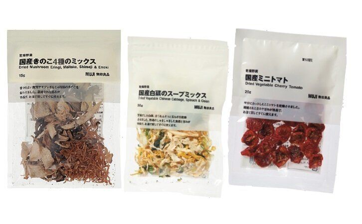 「乾燥野菜 国産きのこ4種のミックス」(15g)、「同 国産白菜のスープミックス」(30g)、