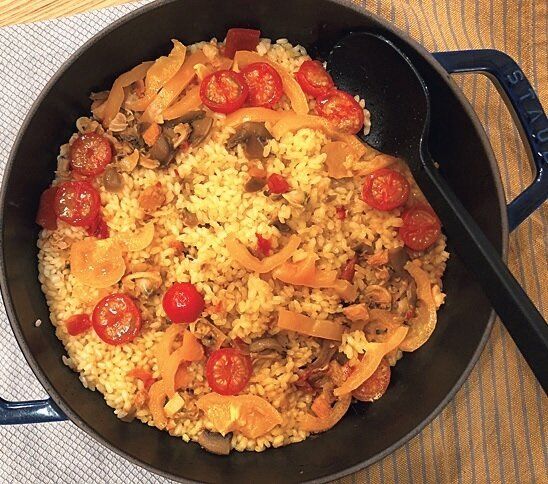 鶏肉と魚介のうまみが凝縮。「トマトとパプリカをプラスして彩りアップ。くせがないやさしい味で、キャンプめしにもいいですよ!」(編集部K)