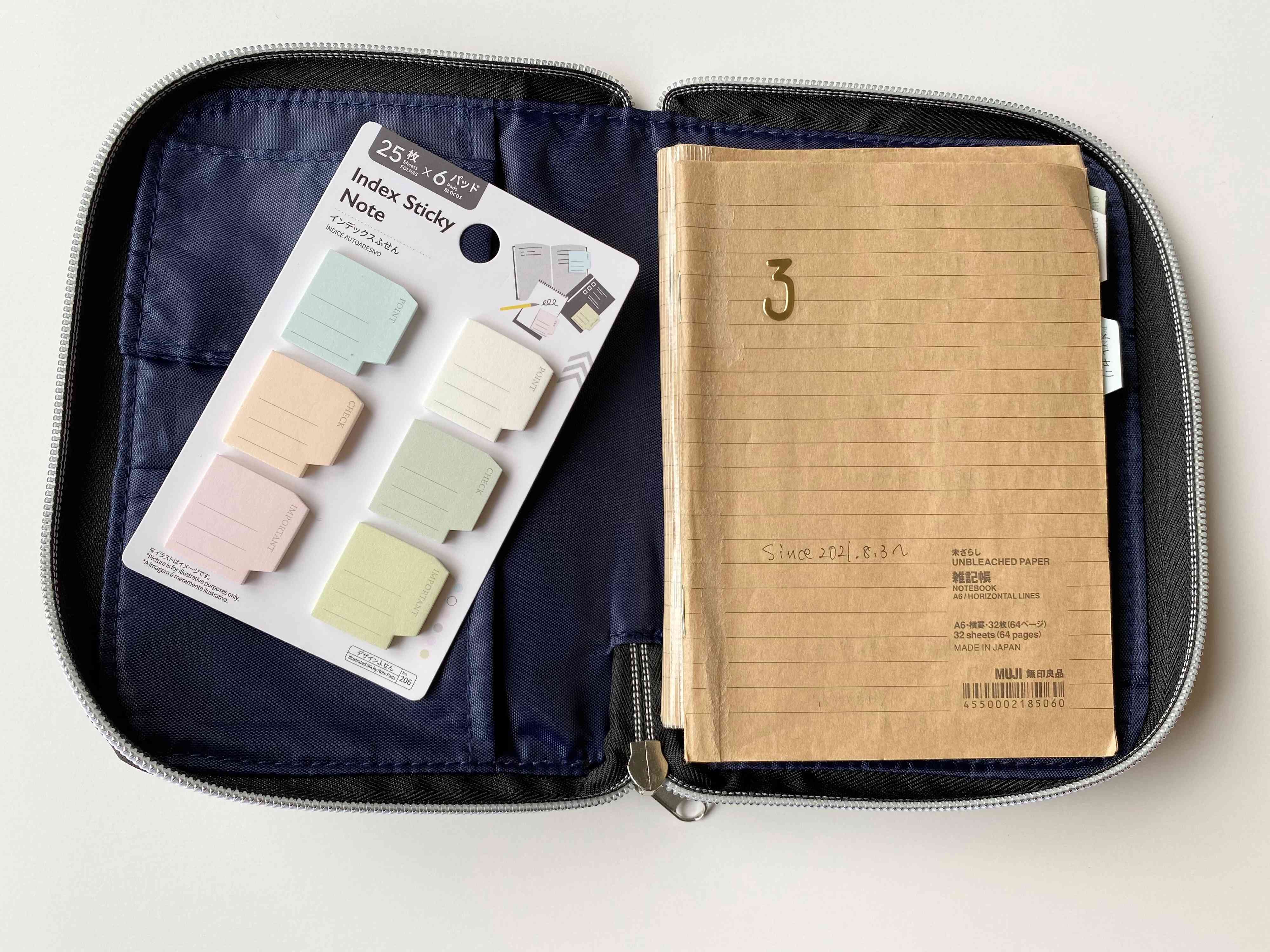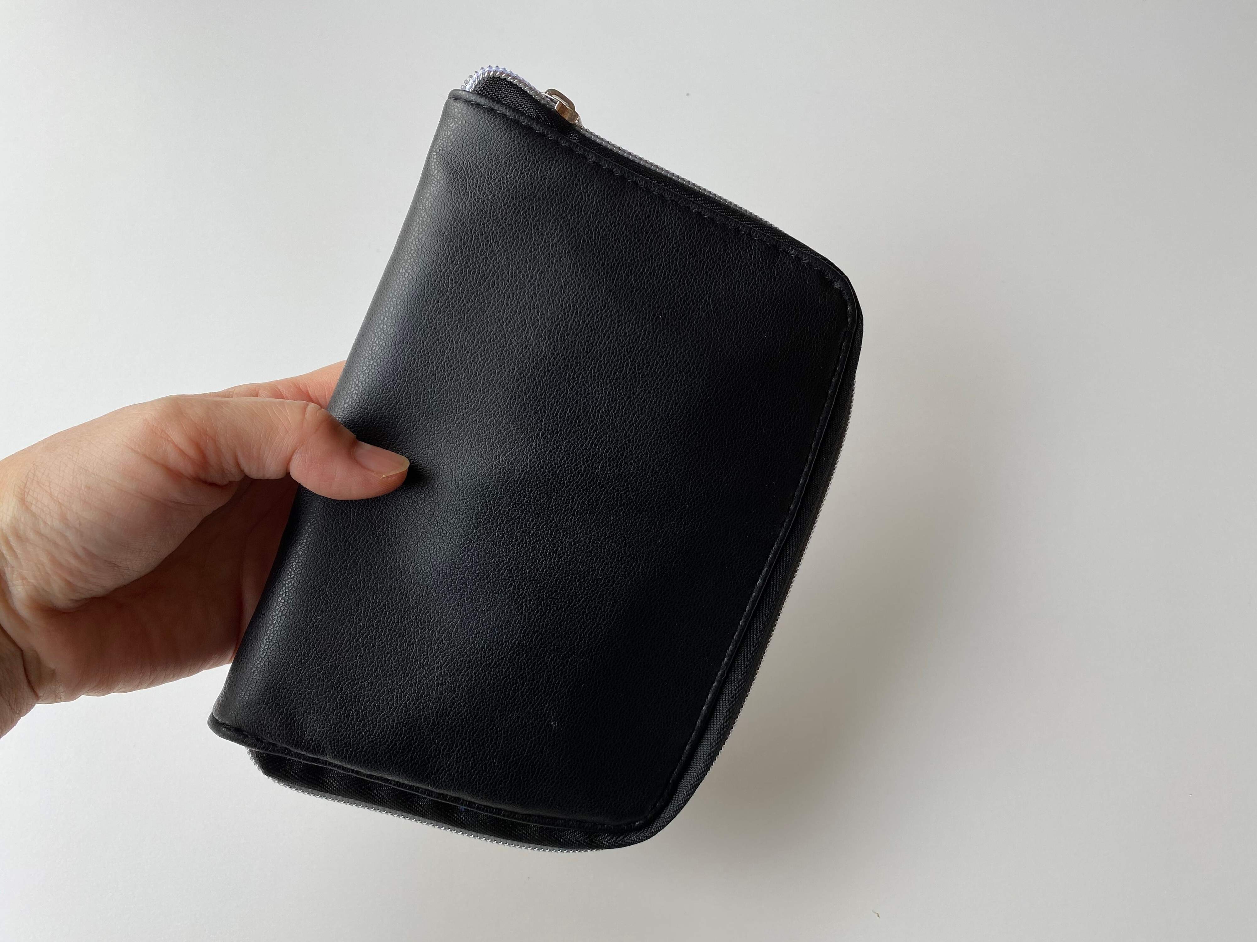 そこで、保管にはファスナー付きのフェイクレザーの文庫本カバーを利用することにしました。イオンの文房具店で100円に値下げされていたものを愛用しています。