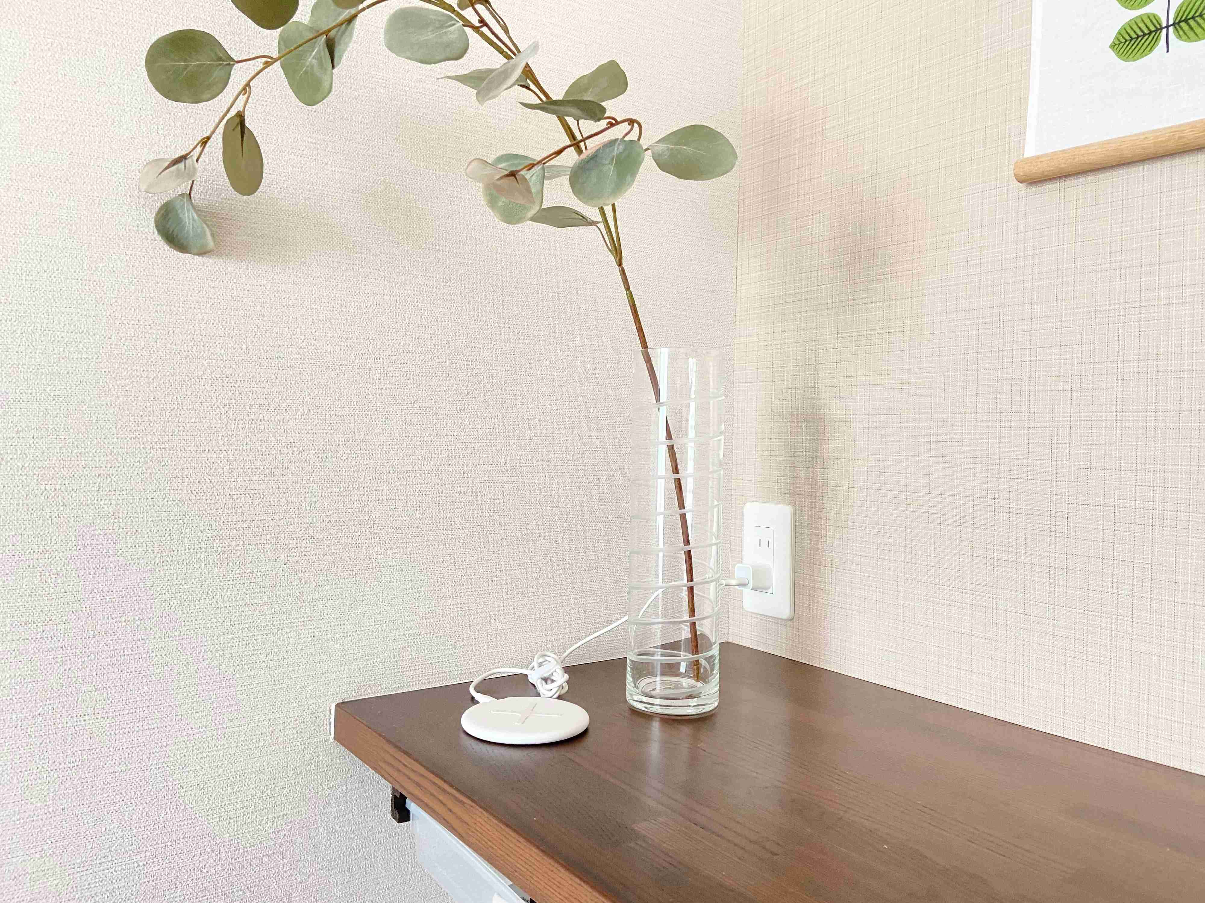 オールホワイトで何と言ってもシンプルで見た目が良いのが特徴。ライトニングケーブルがコンセントにささった状態だとゴチャッと感が出てしまいますが、無印良品のワイヤレス充電器は置いたままでもインテリアに馴染むのが嬉しいところです。