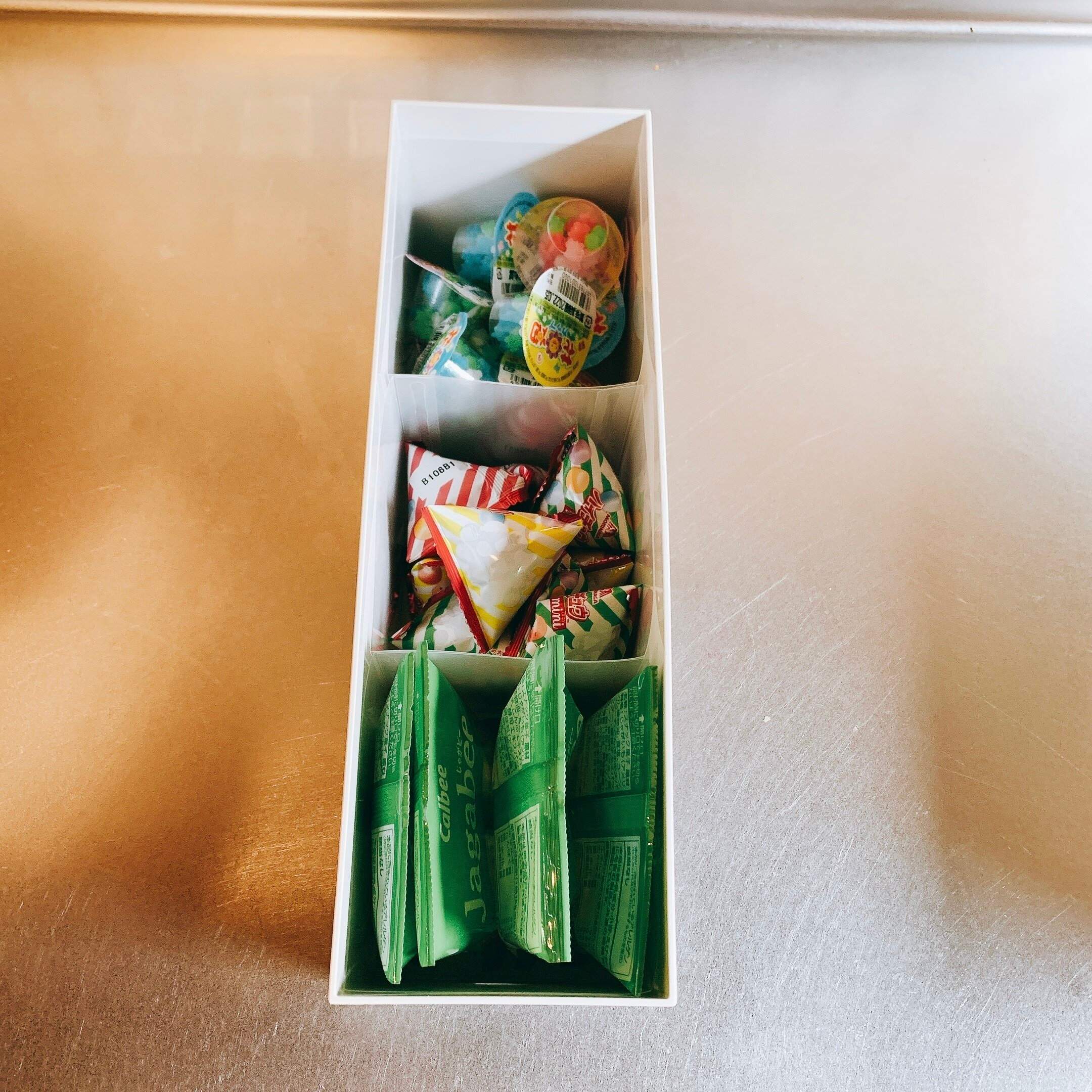 個包装のお菓子を、仕切りごとに入れれば、散らばることなくスッキリ!キッチンやリビングに、そのまま持ち運ぶことも可能です。