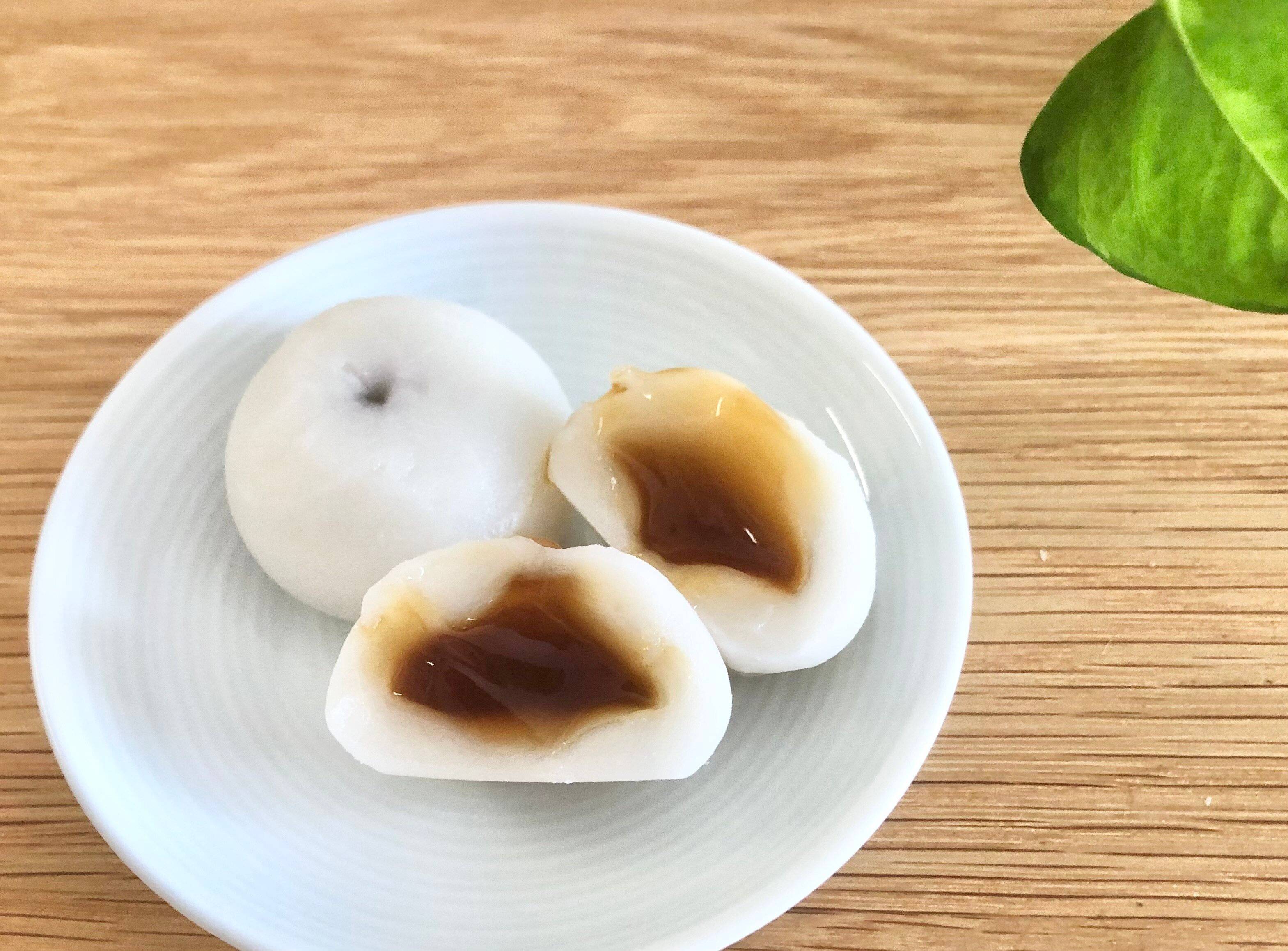 半分に切ってみると、中にはみたらし餡がたっぷり入っています。お団子生地はもっちもちで、コクのある甘じょっぱいみたらし餡はとろっとろで絶品です!