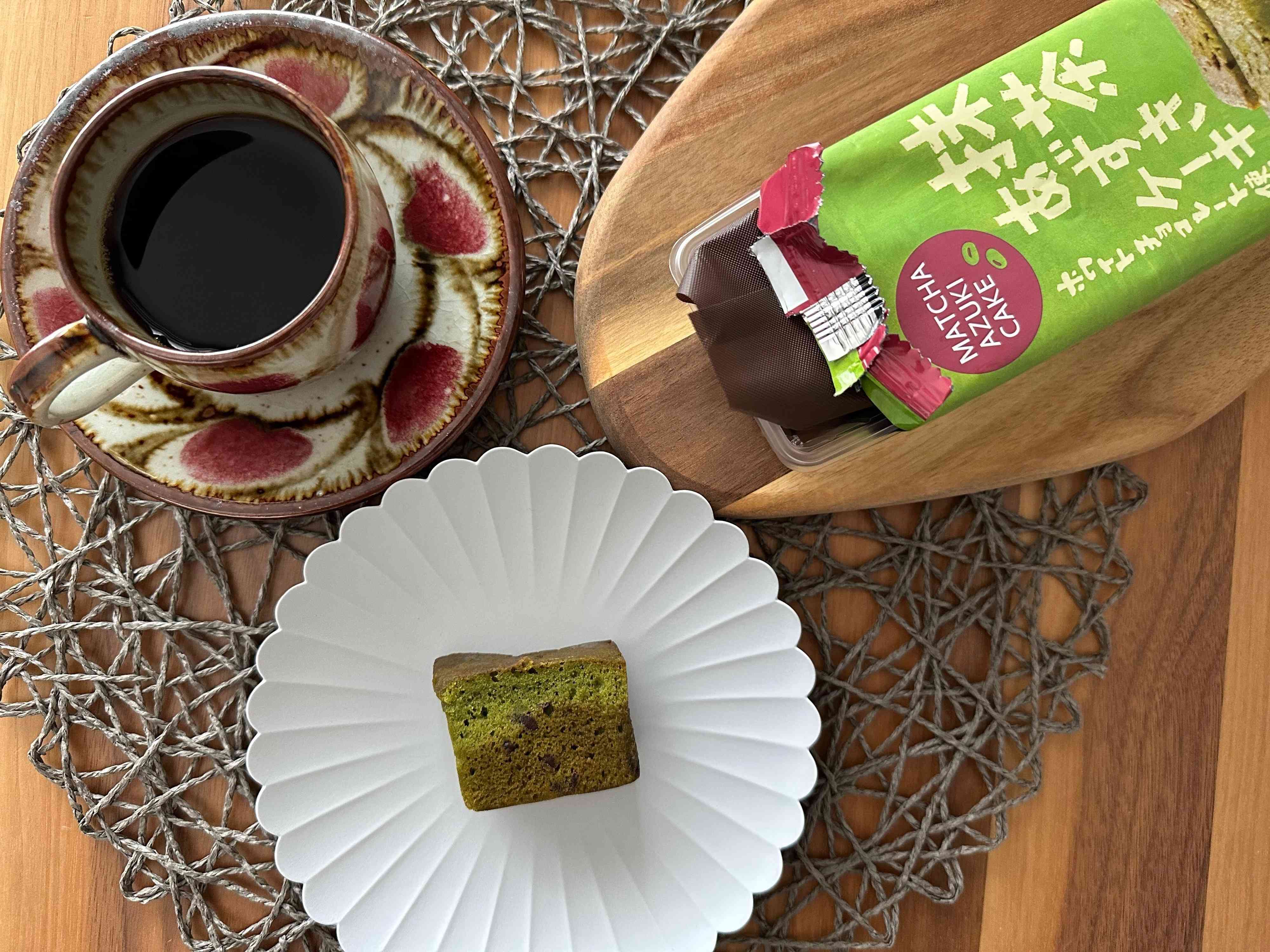 程よいサイズ感と上品で美しいビジュアルはお茶請けにもピッタリ!「抹茶あずきケーキ」はカルディにて販売中です。