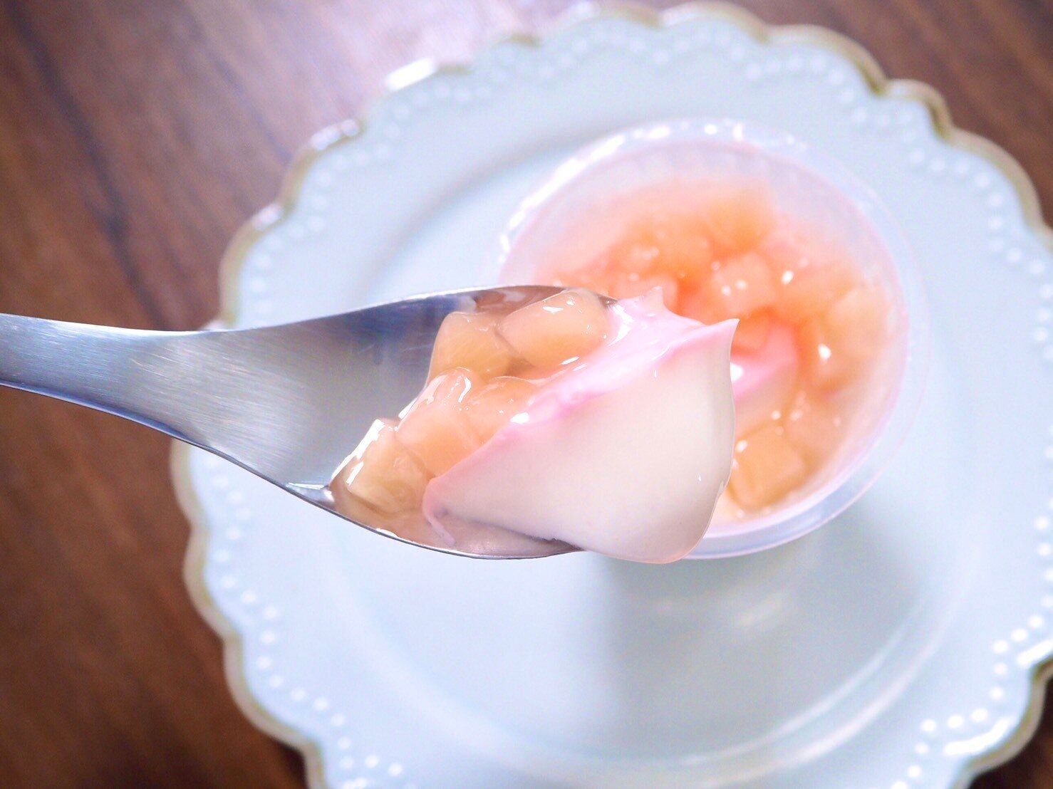 牛乳寒天が8割、上の桃のコンポートが2割といったところです。
