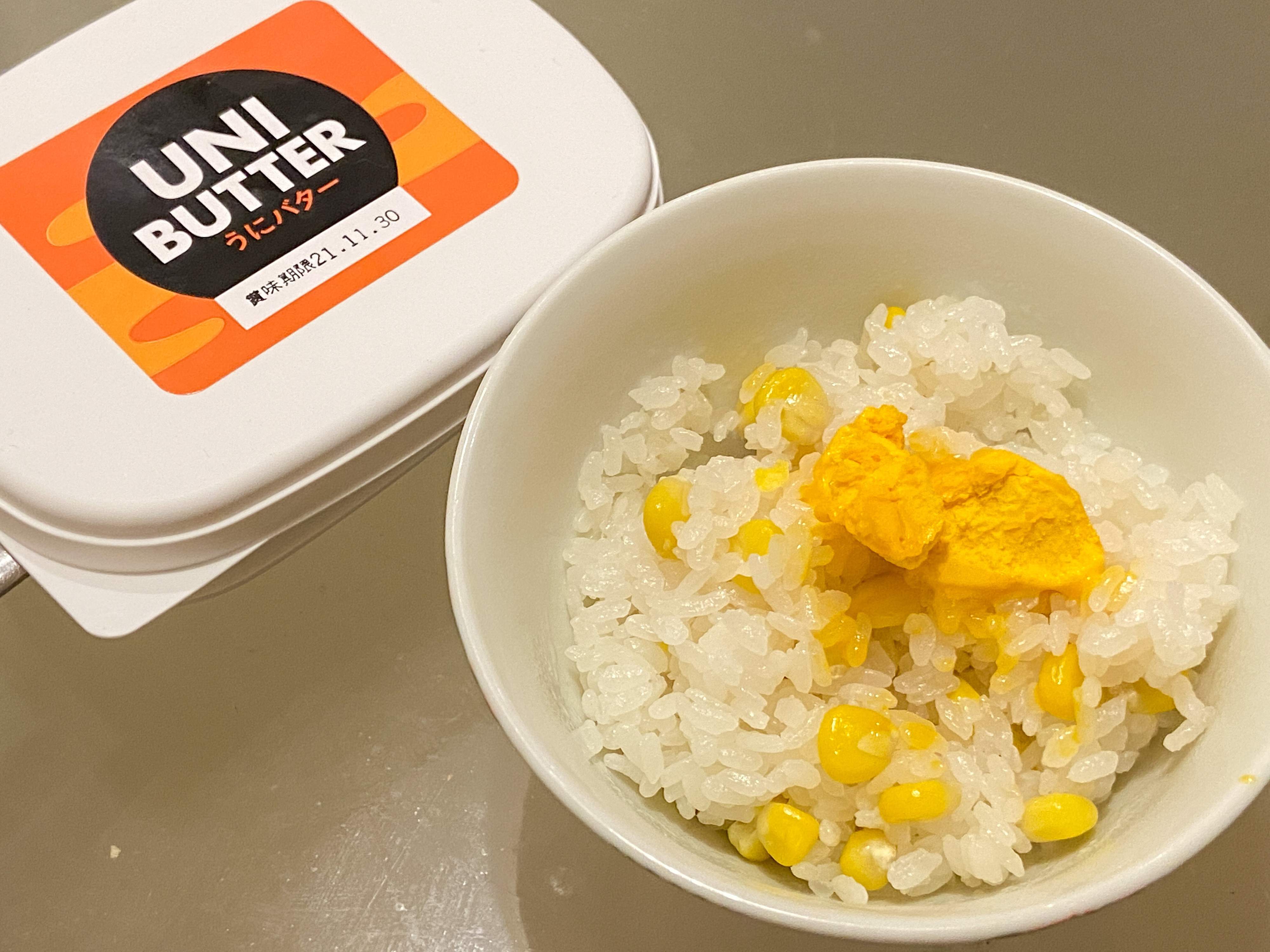 とうもろこしご飯をつくり、カルディのうにバターを乗せてみました。そもそもとうもろこしとバターの相性は抜群ですから、うにバターも合わないわけがありません。