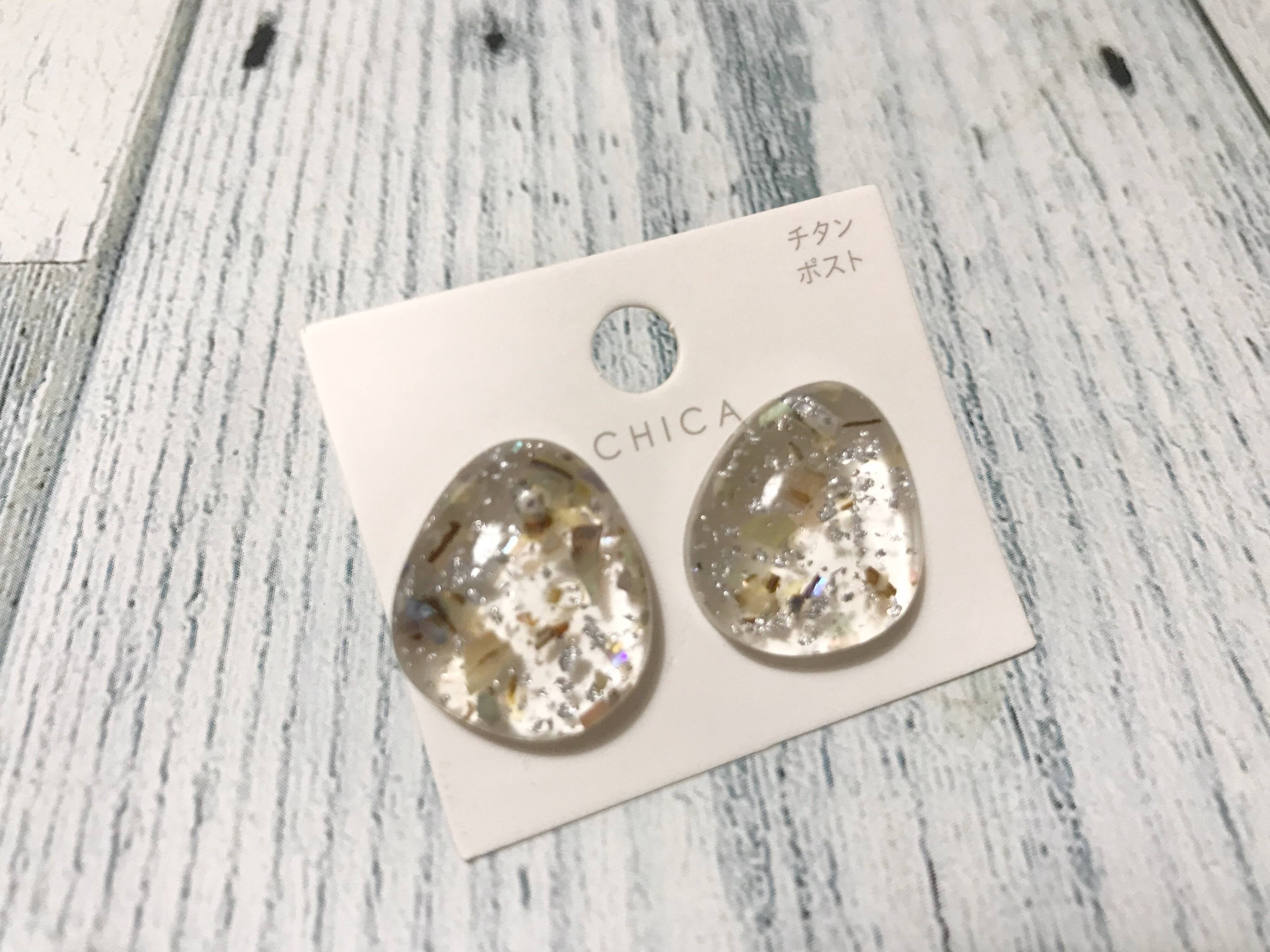 「クリアシェル封入ピアス」(330円)はクリアのアクリル樹脂の中にジェル(青貝)がちりばめられているピアス。