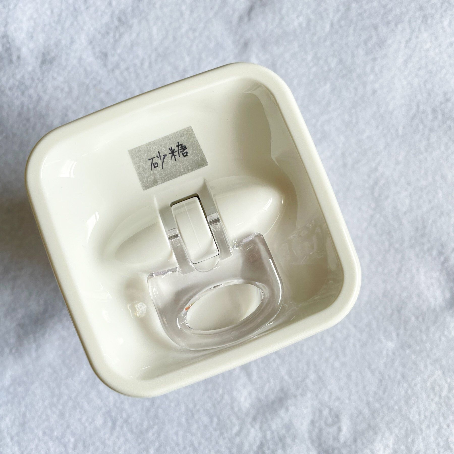 透明な容器ですが目線より見下ろす場所にしまう場合は、中身がわかりにくくなるのでマスキングテープなどでラベリングするのがおすすめです。