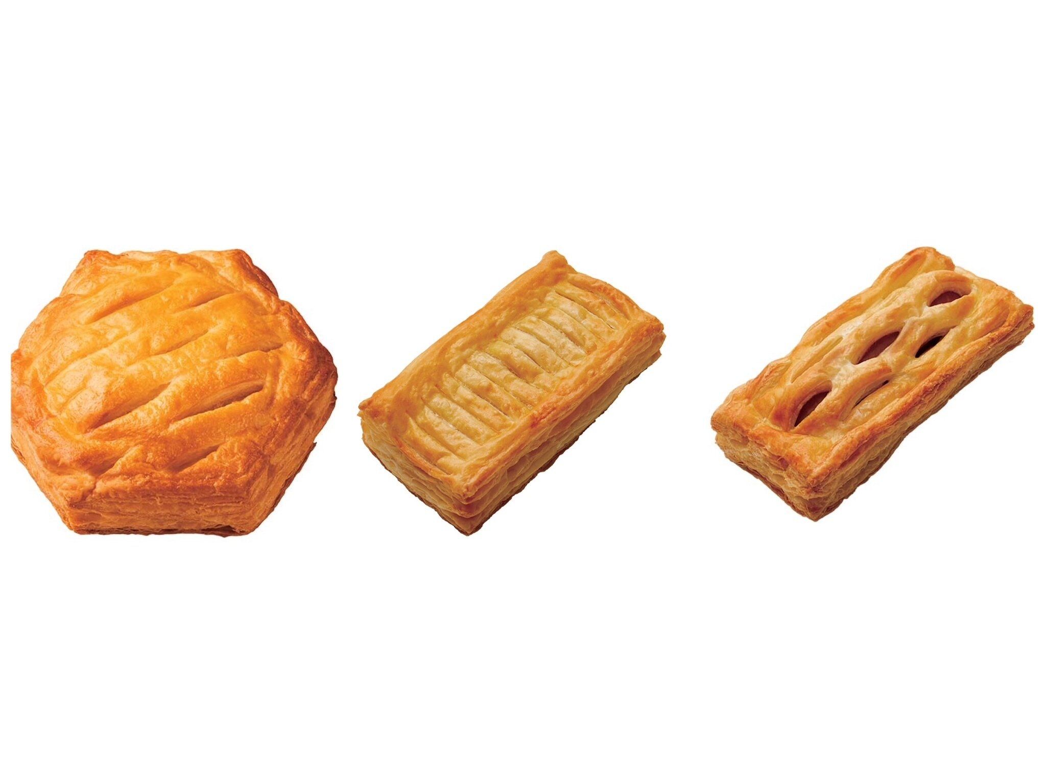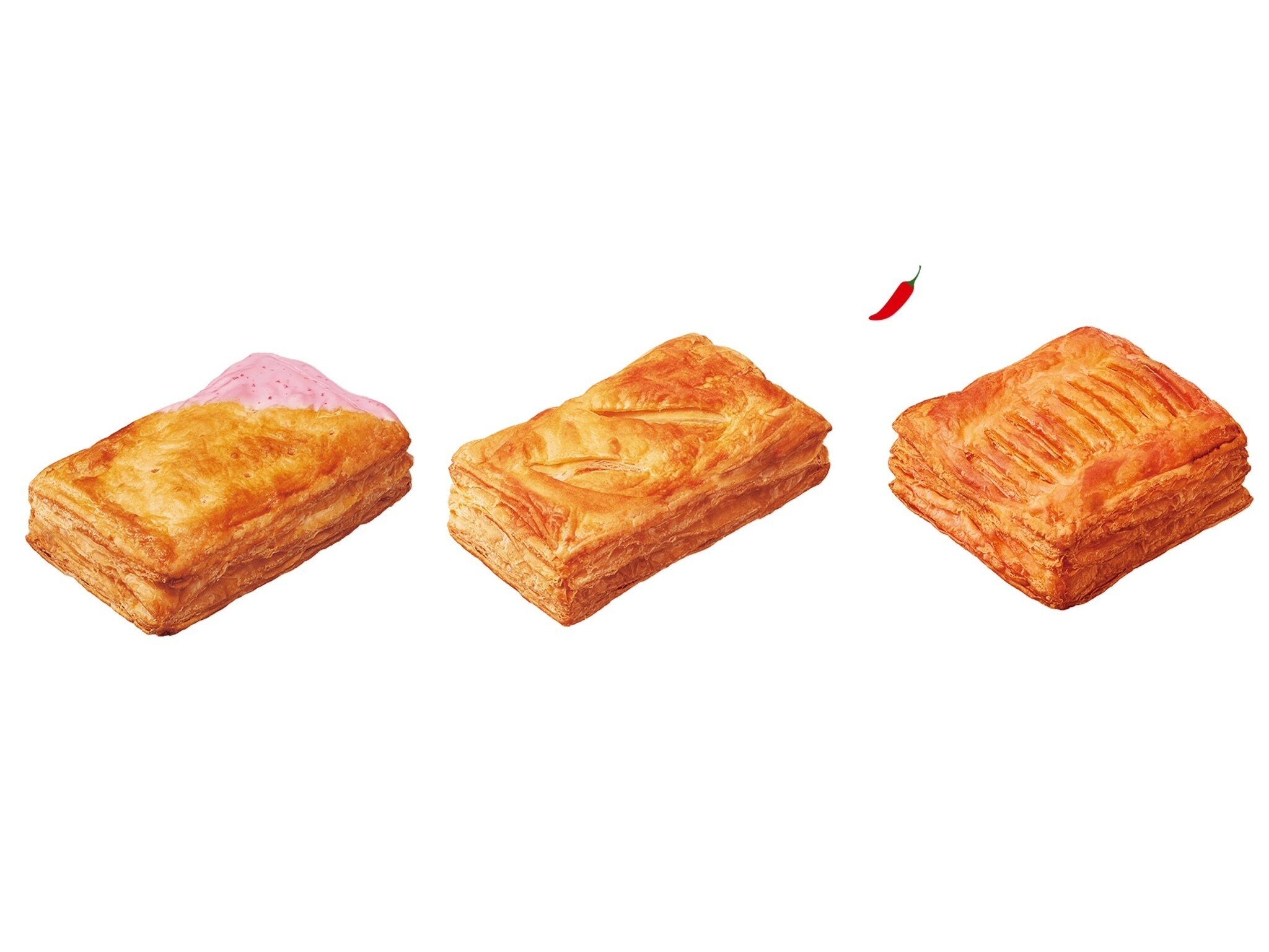 なめらかなレアチーズ風味のクリームにいちごとチェリーのソースを合わせサクサクのパイ生地で包んで焼き上げた「いちごとチェリーのレアチーズパイ」、じゃがいもとベーコンをあわせサクサクのパイ生地で包んで焼き上げた「じゃがいもベーコンパイ」、辛味のあるタコスミートとカマンベールチーズクリームを合わせ、サクサクのパイ生地で包んで焼き上げた「タコスミート&チーズパイ」の全3種類。