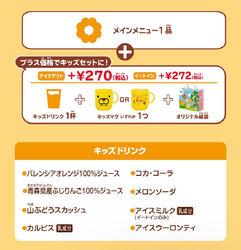 ミスタードーナツでは、メインメニュー1品に270円(税込・テイクアウト価格)or272円(税込・イートイン価格)をプラスすればキッズドリンク1杯・キッズアイテム1個・オリジナル紙袋がセットになったお得なミスドキッズセットがあります。