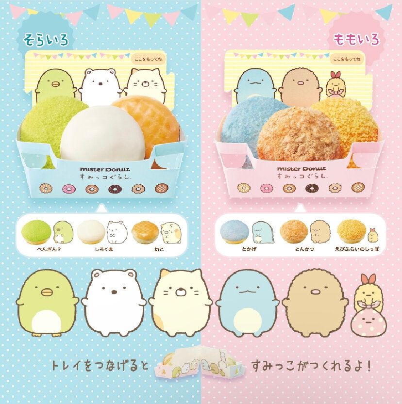すみっコぐらしのしろくま・ぺんぎん?・ねこをイメージしたホワイトチョコ・青りんご風味シュガー・ハニーのミニドーナツのセット「すみっコぐらしミニドーナツ そらいろ」と、とんかつ・とかげ・えびふらいのしっぽをイメージしたきなこシュガー・サイダー風味シュガー・ハニー&ゴールデンのミニドーナツのセット「すみっコぐらしミニドーナツ ももいろ」の2商品展開で発売!ふんわりとした食感が特徴のドーナツです。