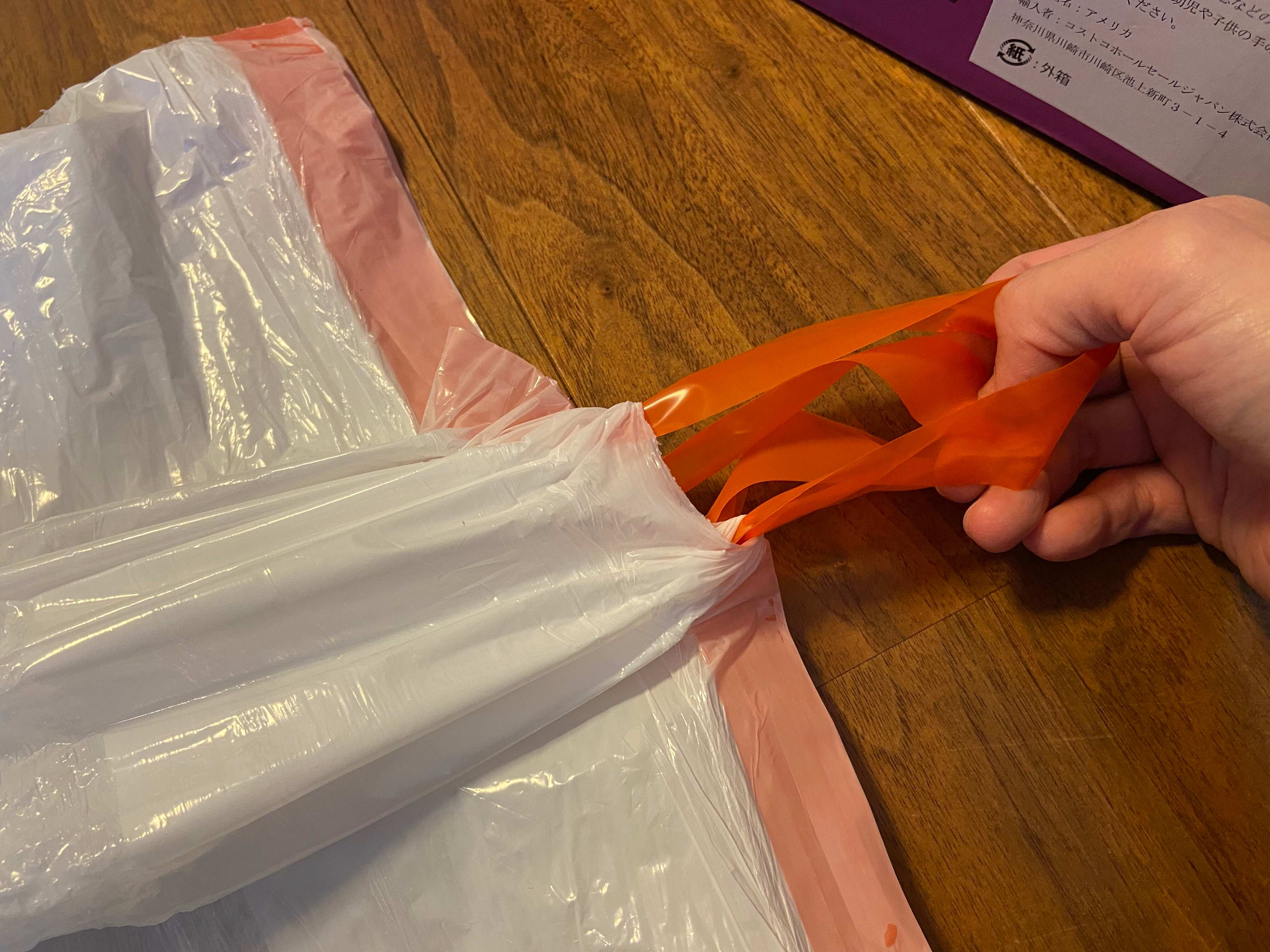 透けにくい白色のポリ袋にオレンジのひもがついています。
